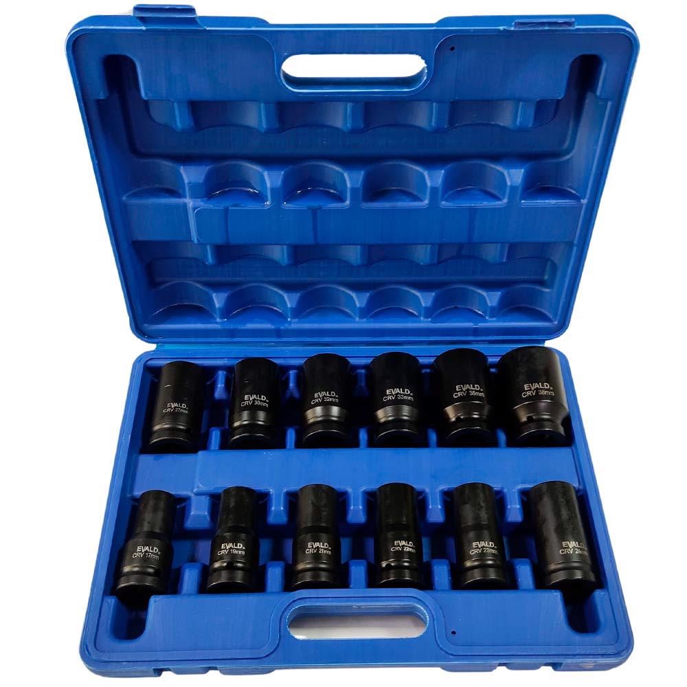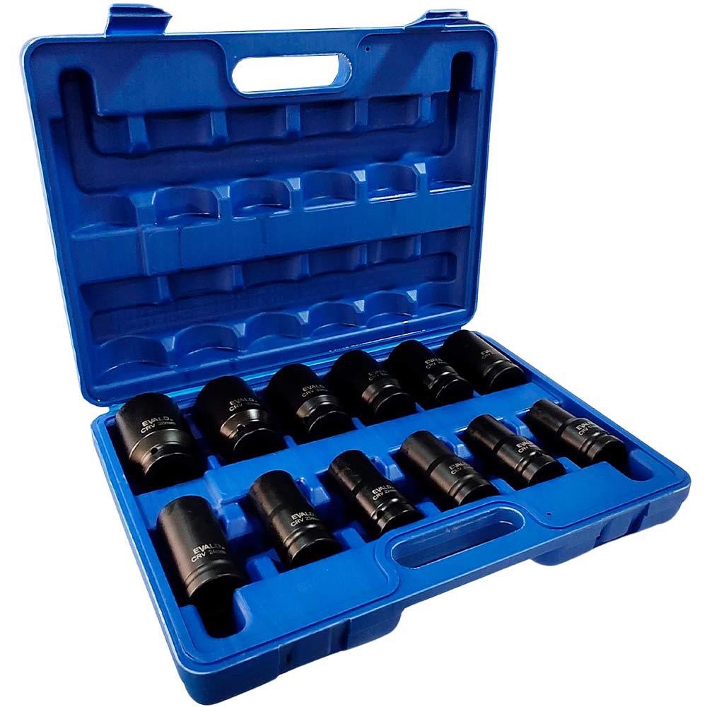 Jogo de Soquetes Longos de Impacto 3/4 POL de 17 a 38 MM Kit com 12 Peças EVSLI-12 EVALD