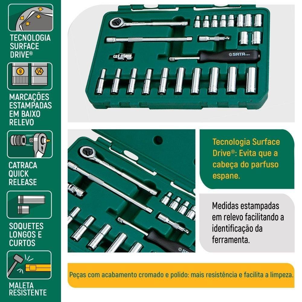 O Jogo de Soquetes Sextavados SATA-ST09098SJ de 1/4 polegadas, composto por 25 peças em polegadas, é uma solução completa para suas necessidades de aperto e desaperto de parafusos. Com uma ampla variedade de tamanhos, esse conjunto oferece versatilidade para trabalhar em uma variedade de projetos e aplicações. Cada soquete sextavado é fabricado com qualidade profissional superior, garantindo durabilidade e desempenho confiável. Eles são feitos de materiais resistentes que suportam o uso frequente e condições exigentes. Este jogo de soquetes inclui uma seleção abrangente de tamanhos, desde os menores até os maiores, para atender às diferentes demandas de trabalho. Com isso, você terá flexibilidade e precisão ao lidar com parafusos de diferentes dimensões. Acompanhado de uma mala organizadora, esse conjunto facilita o transporte e o armazenamento das peças, além de permitir a localização rápida do soquete adequado para cada tarefa. Com essa organização, você economiza tempo e aumenta sua produtividade. Com esse jogo de soquetes, você terá as ferramentas essenciais para enfrentar com precisão e eficiência os desafios diários de aperto e desaperto de parafusos. Seja você um profissional experiente ou um entusiasta que busca qualidade e desempenho superiores, esse conjunto de soquetes é a escolha ideal para suas necessidades. - Características: :: Acessórios em cromo-vanádio - Especificações técnicas: :: Jogo de soquetes sextavados - Conteúdo da Embalagem: :: 1 Chave catraca reversível 1/4" :: 2 extensão para soquetes 1/4" x 6" e 1/4" x 2" :: 10 Soquetes sextavados de 1/4": 5/32", 3/16", 7/32", 1/4", 9/32", 5/16", 11/32", 3/8", 7/16", 1/2" :: 1 Junta universal 1/4" :: 1 Chave adaptadora com cabo e suporte para encaixe quadrado de 1/4", ideal para dar tração usando chave catraca e outras ferramentas :: 10 Soquetes longos de 1/4": 5/32", 3/16", 7/32", 1/4", 9/32", 5/16", 11/32", 3/8", 7/16", 1/2" - Garantia: Vitalícia - Código de barras: 7891645078829 Ref.: SATA-ST09098SJ Marca.: SATA