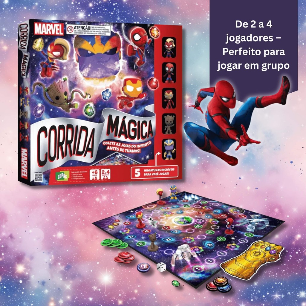 Diversão e aventura com os heróis mais poderosos da Marvel! No Jogo Corrida Mágica Marvel da Copag, os jogadores embarcam em uma corrida cheia de desafios e magia, onde estratégia e sorte definem quem será o grande vencedor. Com personagens icônicos e um visual incrível, essa é a escolha perfeita para reunir amigos e família em partidas cheias de emoção. Destaques do produto: - Personagens da Marvel – Jogue com seus heróis favoritos - Partidas rápidas e divertidas – Ideal para todas as idades - Estimula o raciocínio e a tomada de decisões - De 2 a 4 jogadores – Perfeito para jogar em grupo Prepare-se para correr, usar poderes e viver uma aventura mágica com seus heróis favoritos! Um jogo leve, dinâmico e cheio de ação para todas as idades. Registro INMETRO: 008141/2021 Características: - Marca:Copag - Modelo:35777 *Imagens Meramente Ilustrativas* Conteúdo da Embalagem: - Tabuleiro, cartas, peões e acessórios inclusos