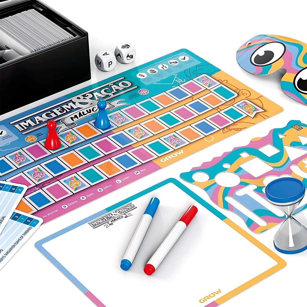 Prepare-se para a diversão! No Imagem & Ação Maluco, cada jogador terá sua vez de brilhar como desenhista ou mestre das mímicas, só que antes... deverá encarar um desafio sorteado no dado! É hora de soltar a imaginação, mas sem palavras ou gestos - só vale desenhar. Desafios como desenhar com a mão NÃO dominante, de olhos vendados, usando um gabarito, de cabeça para baixo, ou até mesmo tendo a sorte de seguir o jogando normalmente vão animar a competição. Com o prazo da ampulheta vencendo, será que seus colegas vão adivinhar a tempo?   - Idade: A partir de 10 anos - Participantes 4 ou mais - Tempo estimado de jogo: 90 minutos - Dimensões da embalagem: 36,0 x 23,0 x 6,8 cm - Certificação Inmetro: CE-BRI/ICEPEX-N 01264-25     Características: - Marca:GROW - Modelo:04694 *Imagens Meramente Ilustrativas*   Conteúdo da Embalagem: - 1 Tabuleiro - 1 Gabarito com formas - 1 Tapa- olho - 1 Lousa para desenhar - 2 Canetas dry pen - 1 Ampulheta - 1 Baralho - 2 Peões - 2 Dados - 1 Regra     jogo imagem e ação - imagem e ação - imagem e acao - jogo de tabuleiro