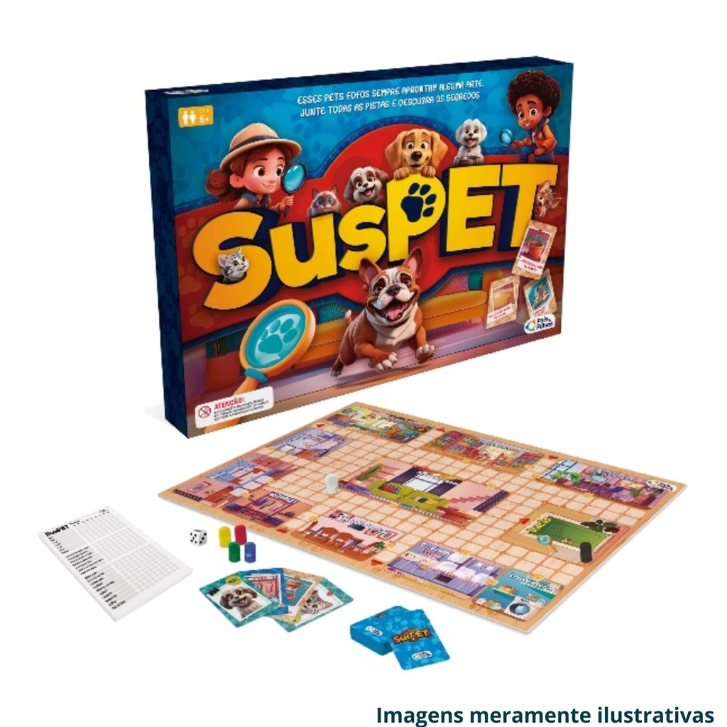 O que os pets têm de fofos, eles têm de travessos! No jogo Suspet, precisamos ser bons detetives, juntar as pistas e descobrir o que eles aprontaram. Um jogo de mistério onde os participantes precisam descobrir qual pet aprontou uma travessura na casa. O jogo conta com 7 suspeitos, 7 travessuras e 10 locais, totalizando 490 possibilidades de combinações. Os jogadores fazem palpites sobre o que aconteceu, e os demais participantes podem refutar as sugestões, apresentando evidências. Quem desvendar o mistério primeiro vence a partida. Especificações: Idade: + 6 anos Medidas da embalagem: 39,0 24,4 x 5,3 cm Material: papel-cartão Características: - Marca: Pais e Filhos - Modelo: 792856-1 *Imagens Meramente Ilustrativas* Conteúdo da Embalagem: - 01 Jogo de Tabuleiro Infantil Suspet Pais e Filhos (1 tabuleiro, 24 cartas, 1 bloco de anotações, 6 pinos plásticos e 1 dado)