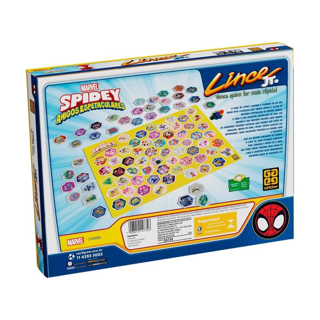 O Lince Jr. Spidey combina a diversão de um dos jogos mais clássicos com vários heróis e vilões do universo espetacular do homem-aranha. O jogo é uma divertida competição na qual sua rapidez e sua memória decidem cada jogada! Os jogadores recebem cartelas com figuras que estão no tabuleiro. Depois do sinal, devem tentar localizá-las rapidamente. Quem encontrar primeiro as figuras será o vencedor. Com um número adequado de figuras, o Lince Jr. será diversão garantida para crianças a partir de 4 anos. Não perca tempo. Prepare seus olhos de Lince e encontre seus personagens favoritos antes de qualquer um!!! - 60 imagens para encontrar - Idade: A partir de 4 anos - Participantes: de 2 a 4 - Tempo estimado de jogo: 20 minutos Especificações Técnicas - Faixa Etária: A partir de 4 anos - Dimensões da embalagem: 31,5 x 23,4 x 4,4 cm - Participantes: 2 a 4 - Certificação Inmetro: CE-BRI/ICEPEX-N 01264-25 - NM300-2004 OCP 0046 Características: - Marca:GROW - Modelo:04734 *Imagens Meramente Ilustrativas* Conteúdo da Embalagem: - 1 tabuleiro, 60 cartelas ilustradas, 12 fichas plásticas, 1 saco plástico e manual de instruções. jogo lince - lince - jogo lince junior - lince junior spidey - spidey - grow