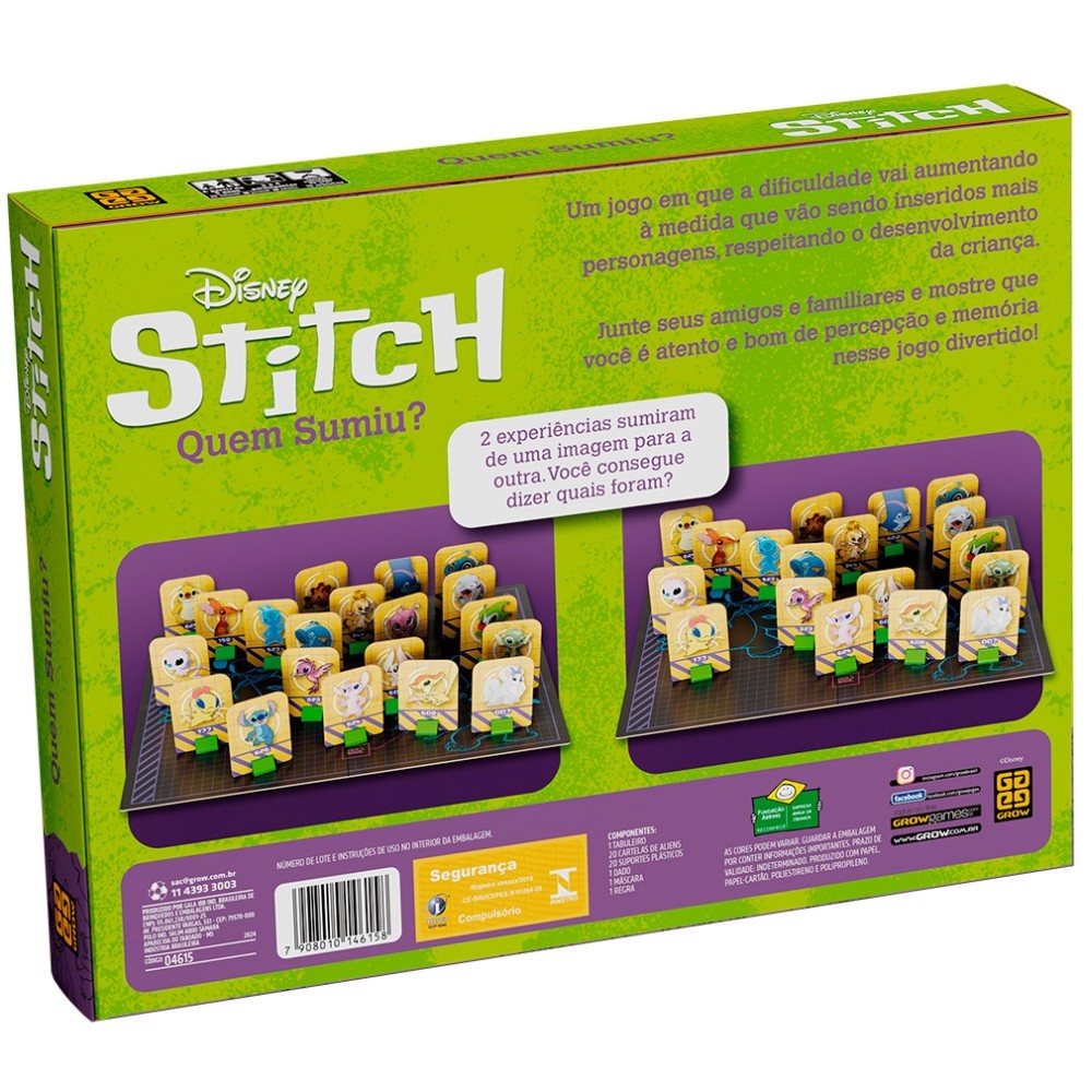 JOGO DE TABULEIRO QUEM SUMIU? STITCH GROW PERSONAGENS DISNEY CRIANÇA DIVERSÃO INFANTIL ALIENS MESA