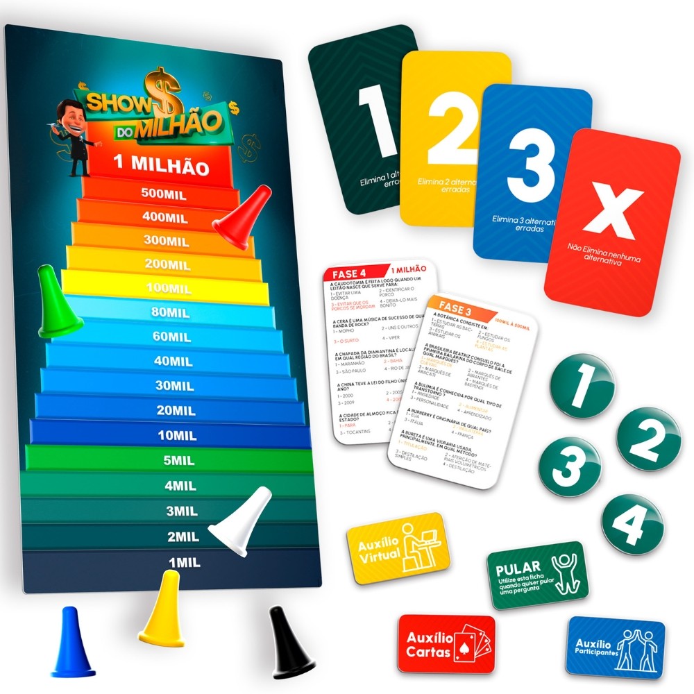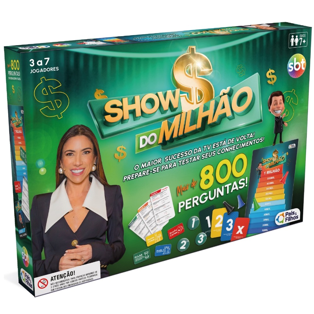 ***PRODUTO PAIS E FILHOS EM PORTUGUÊS, ORIGINAL, OFICIAL, LACRADO E COM NOTA FISCAL*** JOGO DE TABULEIRO SHOW DO MILHÃO PAIS E FILHOS BRINQUEDO 800 PERGUNTAS CARTAS RESPOSTAS TV SBT MESA Informações Técnicas: - Material: Papel Cartão e Resina Termoplástica. - Contém: 168 cartas, 36 fichas de auxílio, 24 fichas de respostas, 6 peões, 4 cartas de auxílio, 1 tabuleiro e 1 regra. - EAN: 7908470029060 - Código: 792906 - Produto certificado: INMETRO REGISTRO:003733/2019 - Dimensões: 6cm x 28cm x 40cm - Peso: 655g - JOGO DE TABULEIRO - 7+ ANOS - De 2 a 7 participantes - PAIS & FILHOS - Garantia: Contra defeitos de fabricação - Prazo de Validade: Indeterminado Obs: O tamanho de cada peça pode sofrer variações. Imagens meramente ilustrativas. O produto e as cores podem variar de acordo com o apresentado na embalagem. ATENÇÃO! NÃO RECOMENDÁVEL PARA CRIANÇAS MENORES DE 3 (TRÊS) ANOS POR PODER GERAR PARTE(S) PEQUENA(S) QUE PODE(M) SER ENGOLIDA(S) OU ASPIRADA(S). Show do Milhão Prepare-se para testar seus mais diversos conhecimentos com o maior game show da TV brasileira em um jogo de tabuleiro colorido e interativo com mais de 800 perguntas. O Show do Milhão, que ganhou sucesso com o grande Silvio Santos, no SBT, agora apresentado por Patrícia Abravanel, ganha uma versão para jogar em casa, com toda a família e amigos! O clássico dos jogos está de cara nova! O maior sucesso da TV está de volta! Prepare-se para testar seus conhecimentos! Mais 800 perguntas! Divididas em 4 fases. --------------------------------------------------- SEJA MUITO BEM VINDO(A) A LOJA DE BRINQUEDOS DO CANAL 40 POR QUÊ COMPRAR NA LOJA DE BRINQUEDOS DO CANAL 40? *Enviamos seu pedido sempre no mesmo dia ou no máximo no próximo dia útil dependendo do horário da sua compra! *Produtos lacrados, originais e oficiais da mais alta qualidade; *Experiência única de compra (incluindo a experiência olfativa - você sentirá nosso cheiro); *Todos os nossos produtos estão à pronta entrega em nosso estoque físico aqui no Brasil; *Seu pedido será enviado com segurança e agilidade; IMPORTANTE: Tenha tranquilidade de comprar com quem está disposto a te oferecer o melhor atendimento, caso tenha algum problema após a compra, conte com nossa equipe de pós venda para solucioná-lo! A LOJA DE BRINQUEDOS DO CANAL 40 tem a missão de garantir a satisfação total do seu cliente, tanto nos produtos quanto no atendimento. Assim estabelecemos uma relação única de confiança! Não encontrou o que procurava? Clique na foto da nossa logo para entrar em nossa loja e ver todos os nossos produtos OU nos mande uma mensagem diretamente aqui pelo chat. SERÁ UM PRAZER ATENDÊ-LO(A)! --------------------------------------------------- MUITO PRAZER, ME CHAMO FELIPE CAMARGO, SOU DONO, CEO E CRIADOR DE CONTEÚDO DO CANAL 40. DESDE JÁ, DEIXO AQUI O MEU MUITO OBRIGADO!!! CANAL 40 - LOJA DE BRINQUEDOS LTDA DEIXE SUA CRIANÇA INTERIOR FELIZ E APROVEITE!