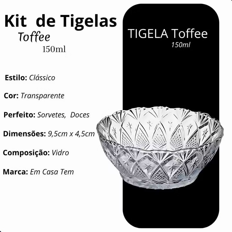 Aqui está a descrição em tópicos do Jogo de Taças de Vidro para Sobremesa Toffee (150ml) da marca Em Casa Tem: Características Principais * Marca: Em Casa Tem. * Linha/Modelo: Toffee. * Material: Vidro transparente de alta qualidade. * Capacidade: 150ml (ideal para porções individuais). * Quantidade: 6 a 24 peças Design e Estética * Acabamento: Design com relevos no vidro (estilo lapidado) que remete à sofisticação do cristal. * Borda: Possui ondulações na borda superior, agregando um diferencial visual. * Base: Base elevada e reforçada, garantindo maior estabilidade na mesa e reduzindo riscos de tombamento. Funcionalidade e Diferenciais * Versatilidade: Perfeita para servir sorvetes, mousses, saladas de frutas, pavês, doces e até pequenos aperitivos. * Resistência Térmica: O vidro é resistente a variações de temperatura, permitindo servir sobremesas geladas ou mornas. * Higiene: Material não poroso que não retém odores nem sabores. * Manuseio: Os relevos externos proporcionam uma aderência mais segura ao segurar a taça. Dimensões Aproximadas (Unidade) * Altura: 6 cm * Diâmetro da boca: 9,5 cm Sugestão de Uso * Ideal para uso diário em família ou para compor mesas postas em ocasiões especiais, festas e eventos, conferindo um toque de elegância e modernidade.