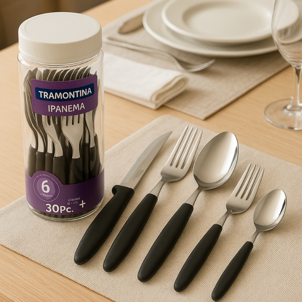 O anúncio contém: 06 Garfos, 06 Facas, 06 Colheres, 06 Garfos De Sobremesa, 06 Colheres De Chá, 01 Pote Multiuso. Se você gosta de ter talheres bonitos e clássicos para acompanhar as suas refeições, o Faqueiro Tramontina Ipanema com Lâminas em Aço Inox e Cabos de Polipropileno com Pote Plástico 30 Peças é a escolha perfeita. As peças dão aquele toque charmoso a sua cozinha e deixam o jantar mais atraente, pois possuem cabos de polipropileno na estilosa cor preta. As lâminas são produzidas em aço inox e oferecem maior durabilidade ao fio devido ao tratamento térmico a que são submetidas. É um faqueiro super prático, pois pode ir à máquina de lavar louças e conta com um pote plástico que pode ser utilizado tanto para armazenar os talheres quanto para organizar sua cozinha. Sua mesa fica muito mais completa com a Tramontina! Benefícios: - Lâminas de aço inox. - As lâminas das facas têm maior durabilidade do fio devido ao tratamento térmico. - Os garfos e colheres garantem maior resistência devido a espessura do aço e a estampagem das lâminas. - Os cabos de polipropileno possuem maior resistência e durabilidade. - Podem ir à máquina de lavar louças facilitando seu dia a dia. - Faqueiro completo. Recomendações De Uso Tenha cuidado ao manusear produtos cortantes e perfurantes e mantenha-os fora do alcance das crianças. Para maior durabilidade dos produtos recomenda-se secar bem antes de guardar, mesmo após lavagem em máquina. Para descarte dos produtos e embalagens siga as orientações de reciclagem vigentes. Informações: Dimensões aproximadas do pote (AxLxC): 27,40cm x 10,40cm x 10,40cm. Dimensões aproximadas da colher de mesa (AxL): 02cm x 04cm. Dimensões aproximadas do garfo de mesa (AxL): 02cm x 02cm. Dimensões aproximadas do garfo de sobremesa (AxL): 01cm x 02cm. Dimensões aproximadas da colher de chá (AxL): 01cm x 03cm. Dimensões aproximadas da faca para churrasco (AxL): 01cm x 02cm. Material do cabo: Cabo Polipropileno. Material da lâmina: Lâmina Inox. Linha: Ipanema. Fabricante: Tramontina. - Produto novo e em estoque - As cores do tecido ou produto podem variar de acordo com o lote de fabricação. - Todos os produtos têm seguro contra extravio