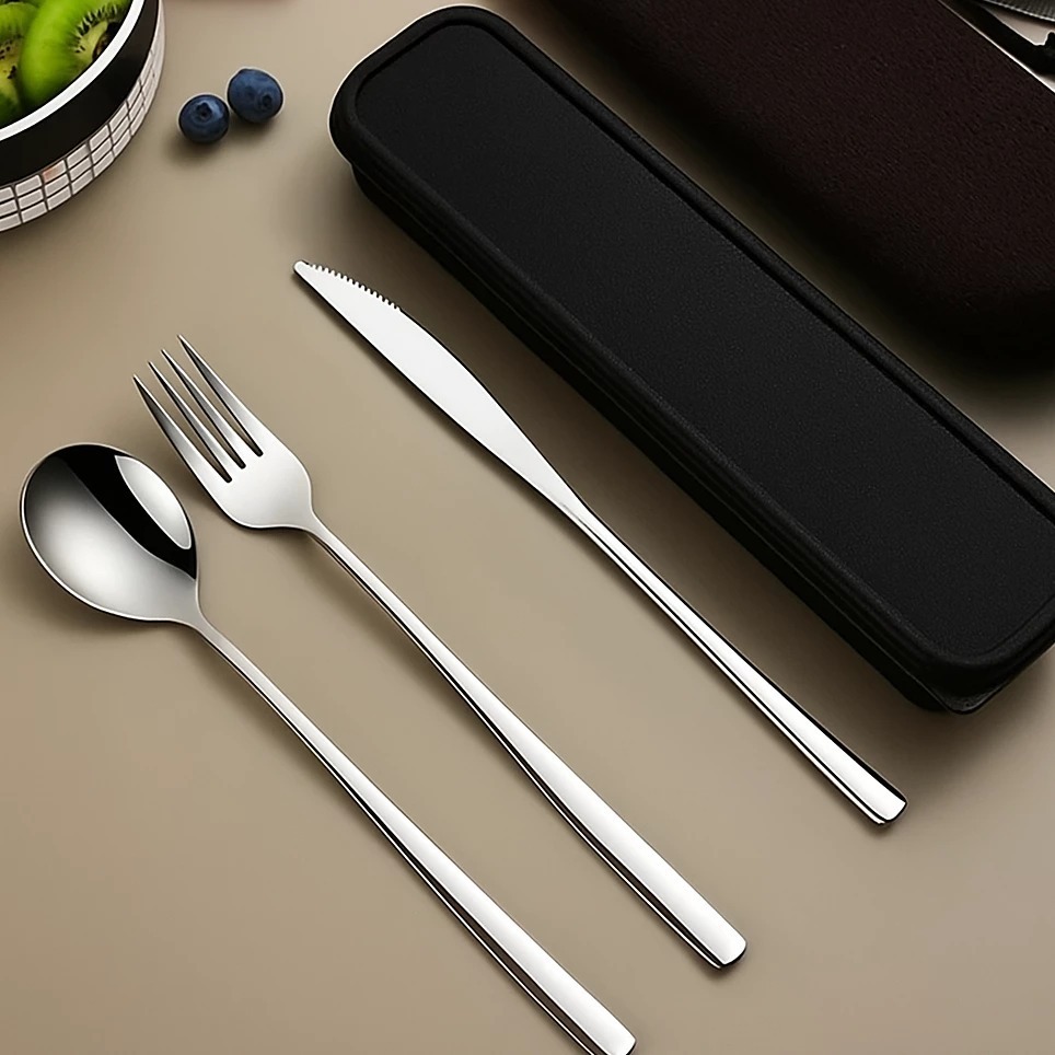 Conjunto de Talheres 3 Peças - Aço Inoxidável Premium Transforme suas refeições com o nosso sofisticado conjunto de talheres de 3 peças, projetado para oferecer elegância e durabilidade. Ideal para jantares especiais e uso diário, este conjunto é feito de aço inoxidável premium, garantindo qualidade e resistência. Características do Produto: Composição do Conjunto: 3 peças, incluindo 1 de cada: 1 Colher 1 Garfo 1 Faca 1 Estojo Material: Aço inoxidável premium, resistente à ferrugem e durável, ideal para uso diário e ocasiões especiais. Design: Acabamento requintado com polimento espelhado, proporcionando uma superfície lisa e elegante. Combina com outros utensílios e eleva a experiência gastronômica. Conforto e Segurança: Borda lisa dos garfos e colheres para maior conforto e segurança durante o uso. Versatilidade: Ideal para uso doméstico, hotel, restaurante, entretenimento, festas, buffets, bistrôs, camping e piqueniques. Fácil de Limpar: Superfície de aço inoxidável polido que é fácil de limpar. Nota: A máquina de lavar louça não é recomendada. Utilize detergente neutro e evite produtos químicos fortes. Medidas Aproximadas dos Talheres: 01 Faca - 21 cm 01 Garfo - 22 cm 01 Colher de Mesa - 21 com 01 Estojo de viagem - 23,5 cm de comprimento e 5,50 cm de largura e 2,8 cm de altura Benefícios: Durabilidade: Feito de aço inoxidável premium, resistente ao uso diário e à corrosão. Elegância: Design moderno e acabamento brilhante que adiciona um toque sofisticado às suas refeições. Conforto: Borda suave que proporciona uma experiência de uso confortável e segura. Versatilidade: Adequado para diversas ocasiões e ambientes, desde jantares informais até eventos formais. Design: ecologicamente correto com certificações SGS, LFGB, CE / EU, CIQ, EEC, promovendo práticas de vida sustentáveis. Conclusão: O conjunto de talheres de 3 peças é a escolha ideal para quem busca qualidade e estilo na mesa. Com sua durabilidade e design elegante, ele se destaca em qualquer ocasião. *****OBSERVAÇÃO! O conjunto de 3 peças na cor ROSA é a única que tem o estojo na cor ROSA. O restante das cores, a cor do estojo é PRETO.