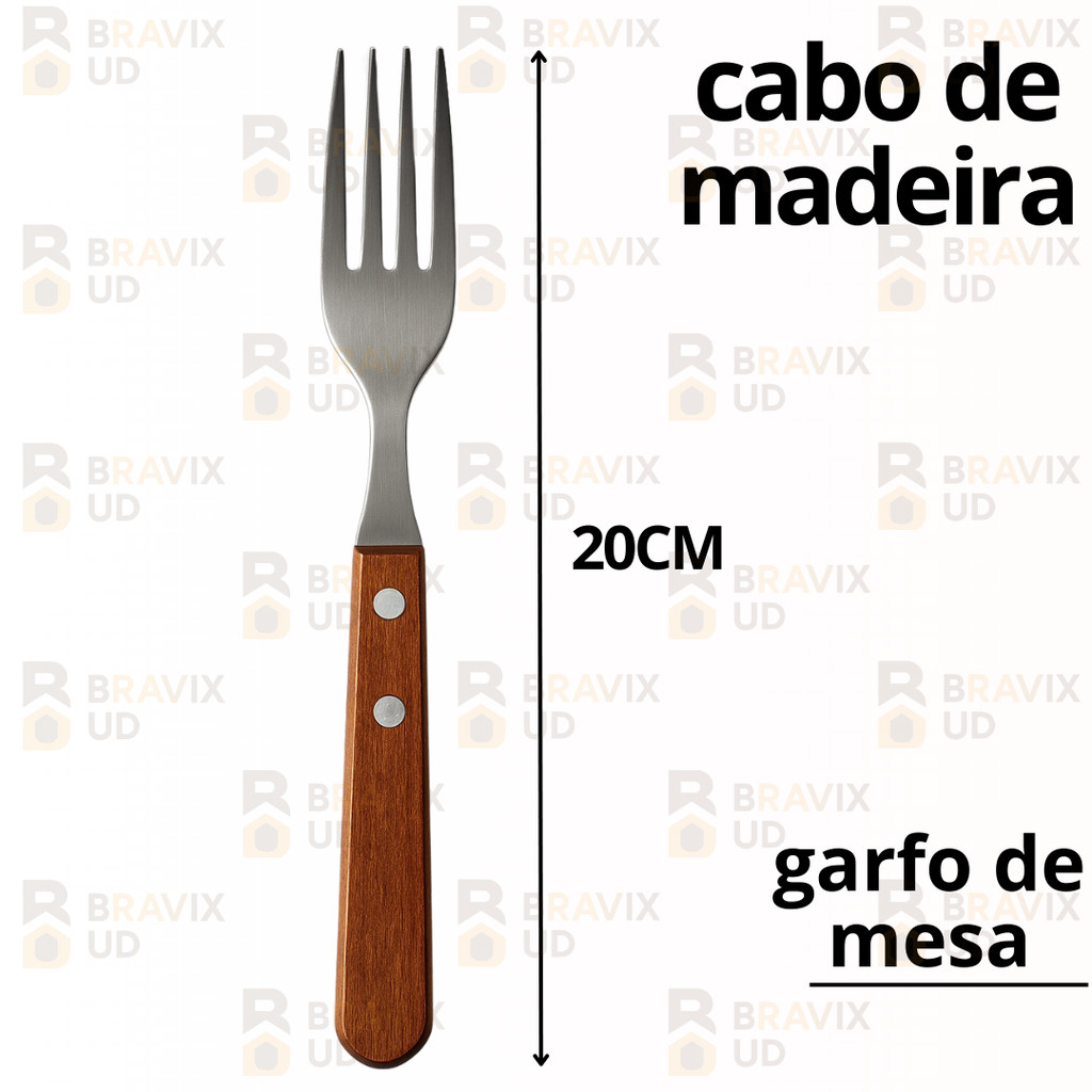Bem-vindo à ARVEN Trabalhamos com produtos de alta qualidade, garantindo, assim, um preço excelente para o consumidor final. Geramos NF-e para TODAS AS VENDAS realizadas para a maior segurança do cliente. Realizamos ENVIO IMEDIATO após a confirmação do pagamento. Kit 36 Talheres de Cozinha em Inox com Cabo de Madeira - 12 Garfos + 12 Facas + 12 Colheres de Mesa Descrição: Adicione um toque de elegância e durabilidade à sua mesa com o Kit de 36 Talheres de Cozinha em Inox com Cabo de Madeira. Este conjunto completo inclui 6 garfos, 6 facas e 6 colheres de mesa, cada um projetado para oferecer um manuseio confortável e uma aparência sofisticada. Feitos de aço inoxidável de alta qualidade e com cabos de madeira resistentes, esses talheres são perfeitos para qualquer ocasião, desde jantares formais até refeições cotidianas. Ficha Técnica: Material dos Talheres: Aço inoxidável de alta qualidade Material dos Cabos: Madeira resistente e ergonômica Itens Inclusos: 12 Garfos de Mesa 12 Facas de Mesa 12 Colheres de Mesa Cor dos Talheres: Prata Cor dos Cabos: Madeira natural Comprimento Total dos Talheres: Garfos de Mesa: 18cm Facas de Mesa: 21cm Colheres de Mesa: 18cm Design: Elegante e funcional, com cabos ergonômicos para um manuseio seguro e confortável Utilização: Ideal para uso diário e ocasiões especiais Manutenção: Lavar à mão com sabão neutro, secar imediatamente para preservar os cabos de madeira Resistência: Resistente à corrosão e ao desgaste Adquira já o seu Kit de 36 Talheres de Cozinha em Inox com Cabo de Madeira e transforme suas refeições em momentos de elegância e prazer com utensílios de alta qualidade!