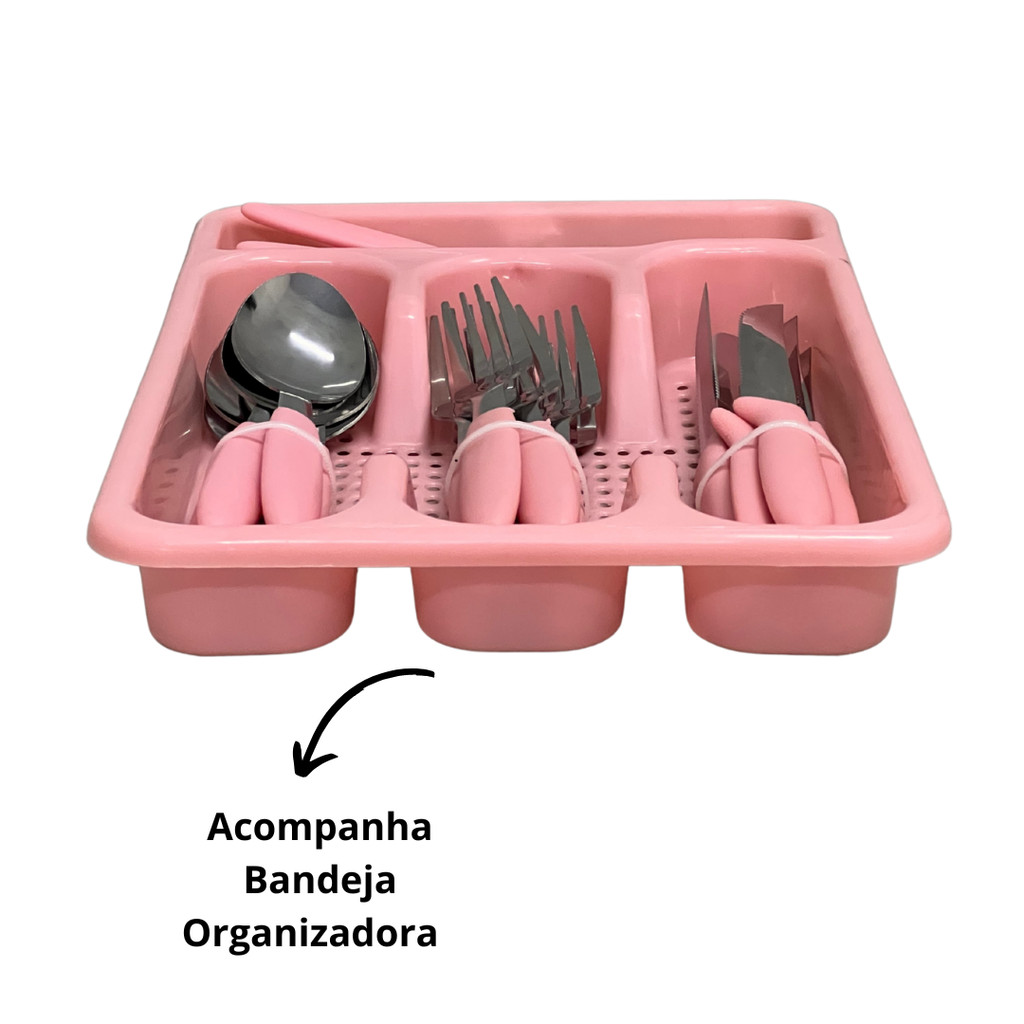 Jogo de Talheres Faqueiro Inox 25 Peças com Porta Talher Bandeja Organizador Rosa