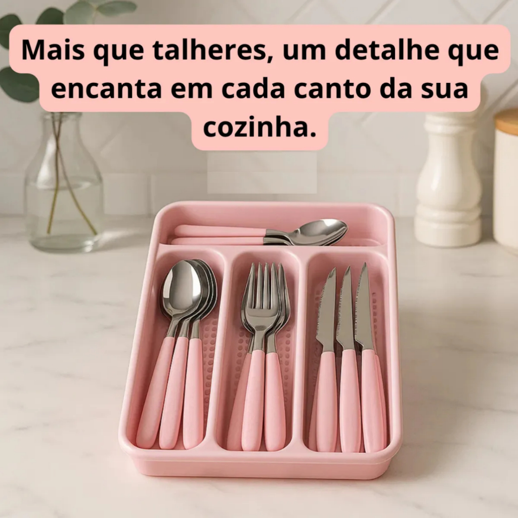 Jogo De Talheres Inox Com 24 Peças + Suporte Gaveteiro