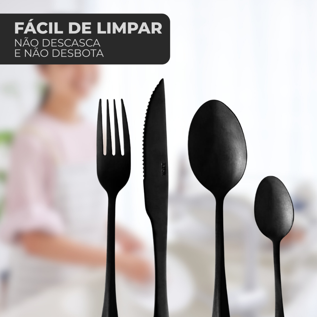 Jogo De Talheres Mesa 24 Pçs Garfo Faca Colher Aço Inox Positano Black Preto Luxo Lyor