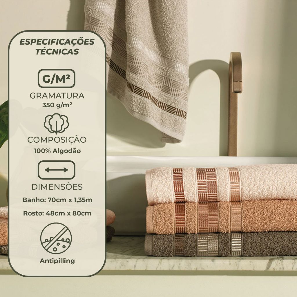 Jogo de Toalhas Moreto Karsten 4 Peças – 100% Algodão 🛁✨ O Jogo de Toalhas Moreto da Karsten foi pensado para quem valoriza conforto, padronização e qualidade no enxoval. Composto por 2 toalhas de banho + 2 toalhas de rosto, oferece praticidade e harmonia para o banheiro. Produzidas em 100% algodão, as peças entregam toque naturalmente macio, excelente absorção e resistência ao uso frequente. A gramatura aproximada de 350 g/m² garante equilíbrio entre leveza, volume e secagem eficiente — ideal para a rotina diária. O acabamento em barra jacquard adiciona elegância discreta, tornando o conjunto versátil para diferentes estilos de ambiente. 🌿 Tecnologia Softmax A linha conta com a tecnologia exclusiva Softmax, que proporciona: ✔ Maciez desde o primeiro uso ✔ Alta capacidade de absorção ✔ Menor encolhimento após lavagens ✔ Melhor preservação da aparência 📦 Composição do Jogo 02 Toalhas de Banho 02 Toalhas de Rosto Corpo 100% algodão Gramatura aproximada: 350 g/m² 🎯 Ideal Para Uso diário Banheiro do casal Organização de enxoval Casa nova 🏡 Presente funcional e sofisticado 🎁 Perguntas Frequentes (FAQ) 1. Esse jogo é suficiente para uso de duas pessoas? Sim. A composição com duas toalhas de banho e duas de rosto atende perfeitamente a rotina de um casal ou permite revezamento no uso diário. 2. A gramatura de 350 g/m² oferece boa absorção? Sim. Proporciona absorção eficiente com secagem mais rápida, sendo prática para uso frequente. 3. As toalhas mantêm o formato após várias lavagens? Sim. O algodão de qualidade aliado ao tratamento aplicado contribui para menor encolhimento e melhor estabilidade dimensional. 4. É um jogo mais leve ou volumoso? Possui perfil intermediário, equilibrando conforto e praticidade sem excesso de peso. 5. O acabamento em jacquard interfere na maciez? Não. O detalhe está concentrado na barra decorativa e não compromete o toque macio do corpo da toalha. Tags #JogoDeToalhasKarsten #ToalhaMoreto #Jogo4Pecas #ToalhaBanhoERosto #100Algodao #TecnologiaSoftmax #AltaAbsorcao #EnxovalCompleto #BanhoConfortavel #ToalhaJacquard #QualidadeKarsten