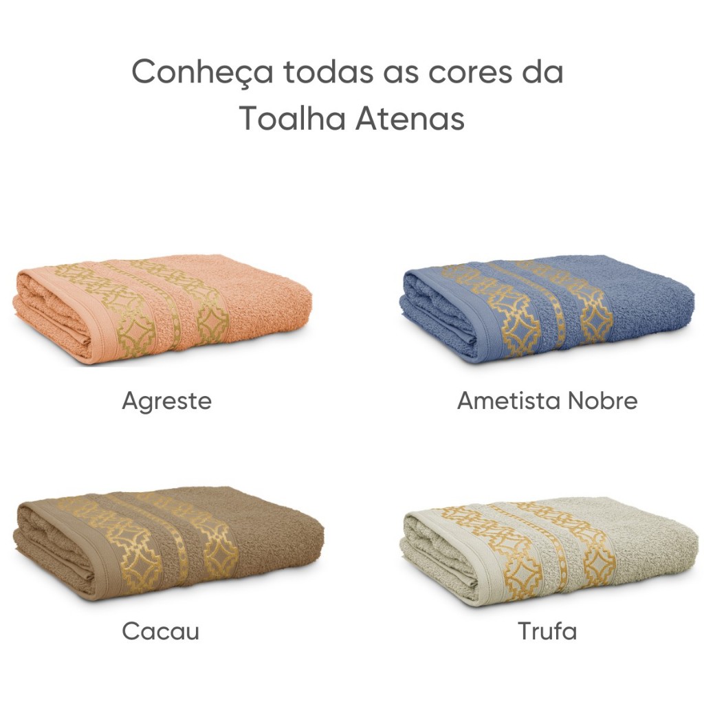 Kit contendo 02 (duas) Toalhas de Banhão e 02 (duas) Toalhas de Rosto. ENVIAMOS SUA COMPRA EM ATÉ 24H ÚTEIS, EXCETO FINAIS DE SEMANA E FERIADOS! Características marcantes da Toalha Atenas: 1️⃣ Design inspirado na arte grega: A Atenas se destaca pela sua barra decorativa com desenhos clássicos e detalhes em jacquard com fio dourado, trazendo um toque de sofisticação único ao seu banheiro. 2️⃣ Tamanho banhão para máximo conforto: Com medidas maiores que as tradicionais, ela garante uma sensação mais aconchegante na hora de se secar. 3️⃣ Alta gramatura com toque macio: Feita em 100% algodão, oferece excelente absorção, sem perder a leveza — perfeita para o uso diário. 4️⃣ Beleza, leveza e funcionalidade: O conjunto une estética refinada, conforto ao toque e praticidade, sendo ideal tanto para o dia a dia quanto para presentear. ✨ Especificações técnicas da Toalha de Banhão Atenas: Composição: 100% algodão Medidas: 78cm x 1,50m Gramatura: 400g/m² Diferencial: Barra decorada em jacquard com fio dourado ✨ Especificações técnicas da Toalha de Rosto Atenas: Composição: 100% algodão Medidas: 45cm x 68cm Diferencial: Barra com detalhes inspirados na arte grega 🧼 Recomendações de uso: Lavar antes do primeiro uso para ativar a absorção Evitar amaciantes em excesso (podem diminuir a absorção) Secar à sombra para manter o brilho e a durabilidade do fio dourado Ideal para uso diário ou para presentear ❓ PERGUNTAS FREQUENTES: – Vocês possuem estoque? Sim! Temos estoque de fábrica de todos os produtos anunciados. – Qual o valor e prazo do frete? Basta inserir seu CEP abaixo do preço do produto e clicar em Calcular. – O envio é rápido? Sim, enviamos seu pedido em até 24h úteis (exceto finais de semana e feriados). – Posso escolher as cores? Sim! Basta selecionar a cor desejada no momento da compra.