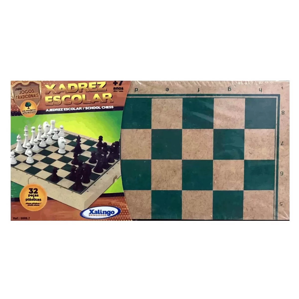 Desafie sua mente e desenvolva suas habilidades estratégicas com o Xadrez Escolar Xalingo 6008.7! Fabricado com tabuleiro em madeira reflorestada (27 x 27 cm) e peças plásticas resistentes, o jogo utiliza tinta atóxica, garantindo segurança para crianças e adultos. O Rei possui altura de 5,6 cm, proporcionando uma experiência de jogo confortável e educativa. Ideal para estimular o raciocínio lógico, a coordenação motora e a concentração, o Xadrez Escolar da Linha Jogos Tradicionais da Xalingo é perfeito para escolas, famílias e todos os apaixonados por jogos de tabuleiro. Produto certificado pelo Inmetro: CE-BRI/IQB 005923. Características: Marca: Xalingo Modelo: 6008.7 Material do tabuleiro: Madeira reflorestada Tinta: Atóxica Dimensões do tabuleiro: 27 cm x 27 cm Altura do Rei: 5,6 cm Indicado para: Crianças a partir de 7 anos Conteúdo da Embalagem: 1 Tabuleiro de madeira 32 Peças plásticas de xadrez Benefícios: Estimula o raciocínio estratégico e lógico Desenvolve habilidades motoras e cognitivas Excelente opção para lazer educativo