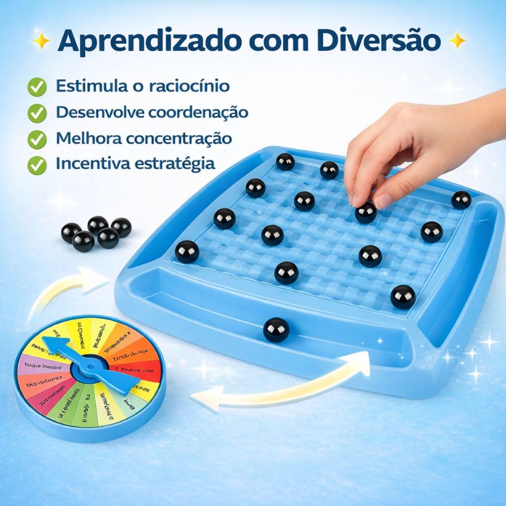 Jogo Magnético Interativo Educativo – Diversão para Crianças e Adultos O Jogo Magnético Interativo é perfeito para estimular o raciocínio lógico, a concentração e a interação entre crianças e adultos. Ideal para brincar em família, ele une aprendizado e diversão em um único produto. Principais Benefícios: Desenvolve habilidades cognitivas: estimula a coordenação motora, lógica, estratégia e foco. Interação entre gerações: ideal para crianças e adultos brincarem juntos, fortalecendo vínculos familiares. Sistema magnético seguro: as bolinhas magnéticas fixam-se corretamente na base, proporcionando jogadas estáveis e envolventes. Acompanha roleta de desafios: torna o jogo mais dinâmico, criativo e imprevisível. Material resistente e durável: produzido em plástico de alta qualidade, com excelente acabamento. Design moderno e atrativo: cores vibrantes que chamam a atenção e incentivam o interesse das crianças. Fácil de usar e transportar: leve, prático e ideal para uso em casa, viagens ou momentos de lazer. Aprendizado lúdico: ensina regras, turnos e tomada de decisões de forma divertida. Conteúdo da Embalagem: 1 Tabuleiro magnético azul Bolinhas magnéticas 1 Roleta colorida Acessórios complementares Saquinho para armazenamento Indicação: Recomendado para crianças e adultos Ideal para uso doméstico, escolar ou recreativo Um jogo envolvente, educativo e perfeito para momentos inesquecíveis em família!