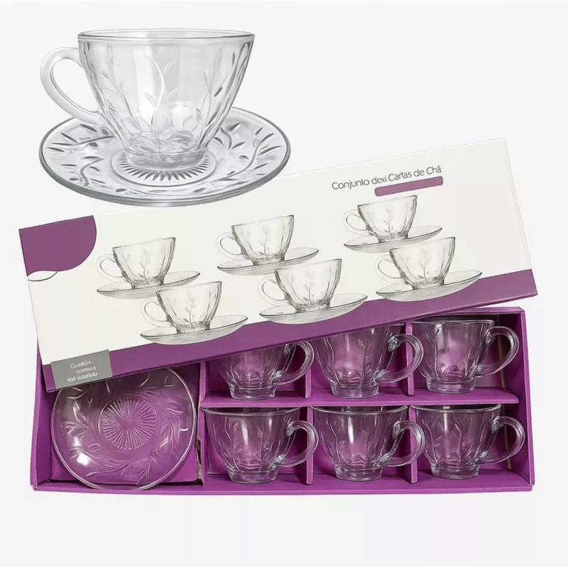 Jogo de Xícara de Cha e Cafe 12 Peças Com Pires Transparente Cristal Vidro 200ml Grande Decorada