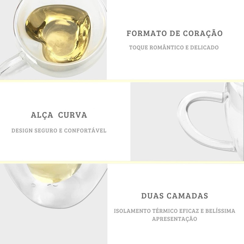Jogo de Xícaras 4 Unidades Vidro Duplo Parede Dupla 80ml Coração P/ Café Chá Suco Água Duas Camadas Caneca Chicaras