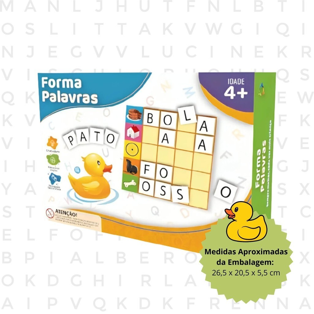 Aprender o alfabeto de forma lúdica e criativa é muito mais interessante para criança e para o mediador do aprendizado. Este jogo ajuda no processo de aprendizado das letras brincando de forma mais fácil e prática de aprender enquanto criança. Habilidades Desenvolvidas: - Linguagem Verbal e Oral - Concentração - Raciocínio - Comunicação Medidas Aproximadas da Embalagem: 26,5 x 20,5 x 5,5 cm Peso (Kg): 0,264 Kg Características: - Marca: Pais e Filhos - Modelo: 3003-1 *Imagens Meramente Ilustrativas* Conteúdo da Embalagem: - 8 cartelas e 160 letras jogo forma palavras - forma palavras - jogo didático - jogos para crianças - jogo pra criança - jogos didáticos