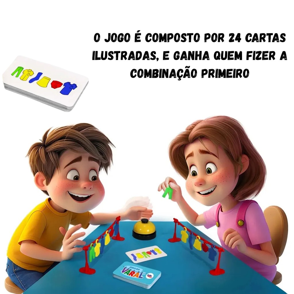 DESCRIÇÃO DO PRODUTO: Jogo do Varal Pakitoys – Diversão, Agilidade e Aprendizado em um Só Brinquedo! O Jogo do Varal Pakitoys é a escolha ideal para quem busca um brinquedo educativo, divertido e perfeito para reunir a família. Indicado para crianças acima de 5 anos, ele estimula a coordenação motora, a atenção e o raciocínio rápido, garantindo momentos de alegria e competição saudável. Como funciona: Uma cartinha é colocada na mesa. Os jogadores correm para montar a combinação indicada e, quem conseguir primeiro, toca a campainha e vence a rodada. No final, quem tiver mais cartinhas acumuladas é o campeão! Simples de aprender, viciante de jogar e perfeito para qualquer ocasião. CARACTERÍSTICAS TÉCNICAS: Conteúdo da Embalagem: 2 Varais, 24 Cartas Ilustradas, 1 Sininho, 8 Cartelas para destacar com: 16 roupinhas sortidas azuis, 16 roupinhas sortidas verdes, 16 roupinhas sortidas amarelas, 16 roupinhas sortidas vermelhas Dimensões Aproximadas da Embalagem: 7 cm x 24 cm x 28 cm (Altura x Largura x Comprimento/Profundidade). Material/Composição: Plástico Idade Mínima Recomendada: A partir de 5 anos Participantes: A partir de 2 pessoas Marca: Paki Toys Referência: 1509 Outras informações: As cores podem variar entre as imagens mostradas acima e o produto. Imagens meramente ilustrativas. Aviso: As informações e imagens divulgadas são de total responsabilidade do fabricante/fornecedor. Produto lacrado e disponível a pronta entrega para todo Brasil! APROVADO PELO INMETRO