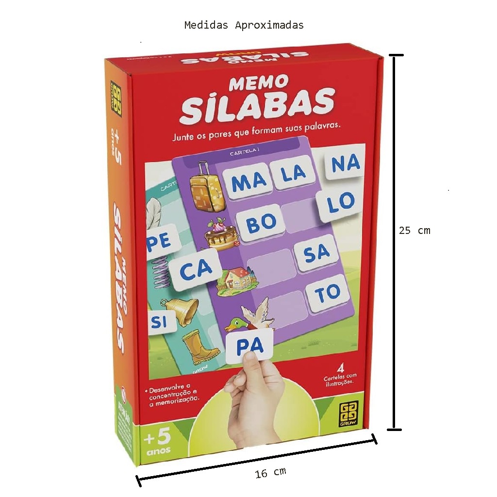 DESCRIÇÃO DO PRODUTO Um jogo de Memória em que a criança constrói as palavras sílaba por sílaba Dessa forma, ela vai assimilando as estruturas básicas das palavras mais simples Memória Sí-la-bas permite à criança o contato com a formação das sílabas em cada palavra De forma divertida, as crianças completam suas cartelas, raciocinando sobre a relação da figura com a palavra escrita. CARACTERÍSTICAS TÉCNICAS Conteúdo da Embalagem: 5 Tabuleiros e 40 cartas com silabas Dimensões da Aproximadas da Embalagem: 24,5 x 18,5 x 4,5 cm (Alt. x Larg. x Compr.) Material/Composição: Papel e Papel Cartão Idade Miníma Recomendada: Acima de 5 Anos Participantes: 2 a 5 Alimentação: Não se aplica Marca: Grow Referência: 01698 Outras informações: Não recomendado para menores de 3 anos por conter partes pequenas que podem ser engolidas APROVADO PELO INMETRO