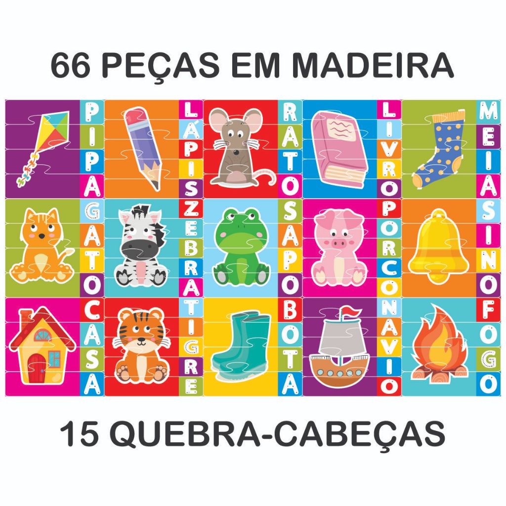 Vamos aprender a soletrar? Ao encaixar as peças desse conjunto de quebra-cabeças, vão surgir algumas palavras e as imagens que as representam. Cada uma das letras esta em uma peca e, então, e hora de separar tudo de novo e remontar, mas pedindo a criança uma letra de cada vez. A maneira mais divertida de virar um mestre da soletração! Aviso legal • É recomendável a partir dos 4 anos.