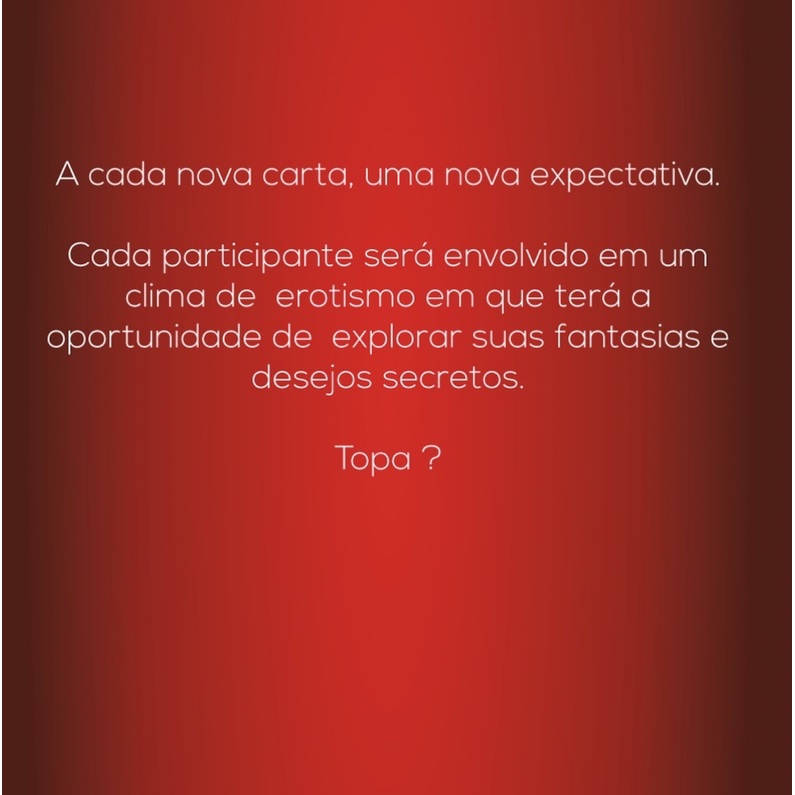 🔥 SECRET X – O JOGO QUE VAI APIMENTAR SEUS MOMENTOS! 🔥 Transforme encontros comuns em experiências inesquecíveis! Secret X é um jogo envolvente e sensual, perfeito para casais ou grupos de até 8 pessoas que querem explorar fantasias e desejos de forma divertida e excitante. 🎲 Como jogar? Sorteie combinações surpreendentes entre jogadores, partes do corpo e ações sensuais. Beijar, morder, acariciar... O destino decide, você realiza! Use a venda para os olhos e intensifique a experiência. 💥 Destaques do jogo: ✅ Ideal para casais ou grupos adultos ✅ Cartas com inúmeras possibilidades de interação ✅ Clima envolvente de sedução e mistério ✅ Perfeito para quem quer sair da rotina com ousadia Está pronto para embarcar nessa aventura? Secret X vai desafiar seus sentidos e elevar sua noite a outro nível! 🔥 Compre agora e descubra o prazer do inesperado! 🔥