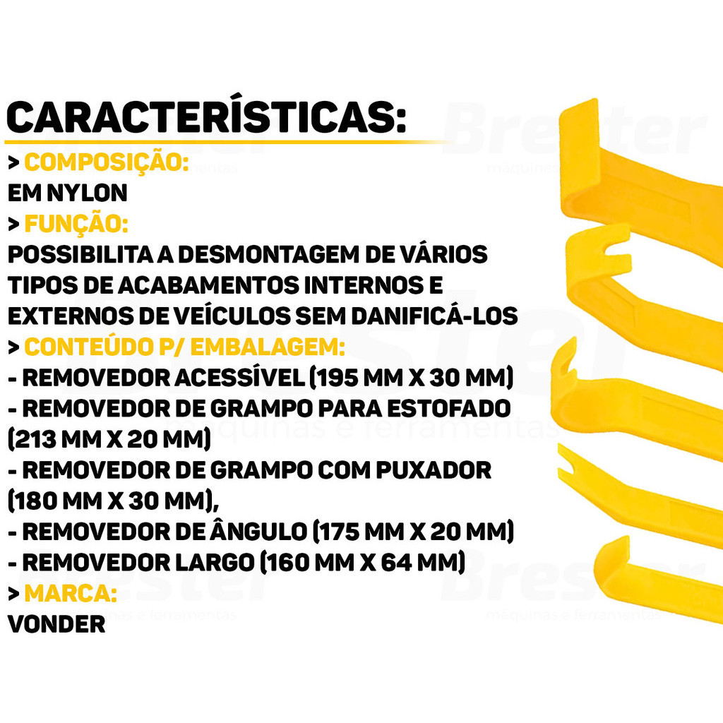 Olá, Bem vindo a Distribuidora Brester. Trabalhamos com uma grande variedade de ferramentas elétricas e manuais, descartáveis, eletroeletrônicos, artigos para casa, artigos de petshop e outros. Aqui você encontrará Produtos Originais, Nota Fiscal, Pronta Entrega e Envio Imediato! Informações do Produto: Espátulas De Nylon Jogo Com 5 Peças Vonder Este conjunto exclusivo de 5 espátulas de nylon foi projetado para tornar seus reparos automotivos mais fáceis e precisos. Não se preocupe mais com danos à pintura ou resíduos teimosos. Com as Espátulas de Nylon Vonder, você terá em mãos a solução ideal para qualquer trabalho de funilaria ou instalação! Características: > Utilizada no interior de veículos, na desmontagem de painéis, forros de portas e estofados. Também podem ser utilizadas na desmontagem de computadores e eletrônicos em geral; > Fabricadas em nylon, possibilitam a desmontagem de vários tipos de acabamentos internos e externos de veículos sem danificá-los, além de proporcionar uma excelente resistência. Especificações Técnicas: > Material: nylon; > O kit acompanha: - Removedor largo: 160mm x 64mm; - Removedor acessível: 195mm x 30mm; - Removedor de ângulo: 175mm x 20mm; - Removedor de grampo com puxador: 180mm x 30mm; - Removedor de grampo para estofado: 213mm x 20mm. - Marca: Vonder - Garantia: 90 dias contra defeitos de fabricação Vantagens de comprar na Brester: - Nota fiscal para Pessoa Física e Pessoa Jurídica; - Produto novo, com garantia de fábrica; - Produto a pronta entrega; - Envio em até 24hs em dias úteis após confirmação do pagamento. Obrigado por escolher a Brester Máquinas.