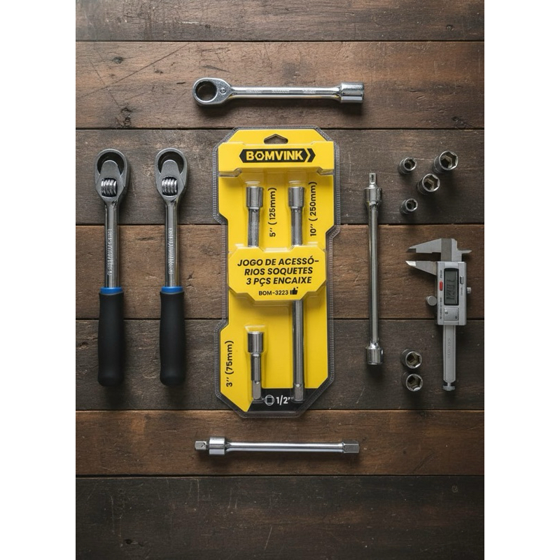 Potencialize sua caixa de ferramentas com o Jogo de Barras Extensoras Bomvink, a solução definitiva para alcançar parafusos e porcas em locais profundos ou de difícil acesso. Desenvolvido para oferecer máxima versatilidade em trabalhos mecânicos e manuais, este kit garante que você nunca mais seja interrompido por falta de alcance. Principais Benefícios: Alcance Versátil: Inclui 3 tamanhos diferentes (75mm, 125mm e 250mm) para se adaptar a qualquer necessidade de profundidade. Alta Resistência: Fabricado em aço 1045 com tratamento térmico localizado, suportando grandes torques sem deformar. Segurança no Uso: Possui esfera de retenção que trava o soquete firmemente, evitando quedas acidentais dentro do motor ou máquinas. Ergonomia e Aderência: Ranhuras antiderrapantes na interface que facilitam o manuseio, mesmo com mãos sujas de óleo ou graxa. Especificações Técnicas: Material: Aço 1045 com acabamento Cromo Vanadium Encaixe: 1/2" Comprimentos: 3" (75mm), 5" (125mm) e 10" (250mm) Modelo: BOM-3223 Por que escolher este produto: Este jogo de acessórios é indispensável para mecânicos profissionais e entusiastas da manutenção que buscam durabilidade e precisão. O acabamento metálico cromado não apenas confere um visual profissional, mas também protege as peças contra corrosão, garantindo uma longa vida útil mesmo sob uso severo em oficinas. Adquira agora o seu kit e tenha a ferramenta certa para cada desafio na sua oficina!