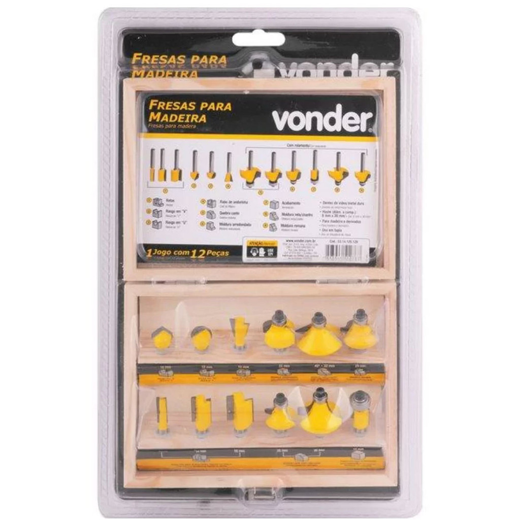 Jogo Fresas para Madeira 6mm 12 Pcs 53.14.120.120 Vonder Jogo de fresas indicada para Trabalhos em madeira e Derivados com 12 peas, sendo: 3 - Fresas retas (6mm, 12mm e 16mm); 1 - Fresa para rasgo em V (12mm); 1 - Fresa para rasgo em U (12mm); 1 - Fresa rabo de andorinha (12mm); 2 - Fresas com rolamento de 9mm para quebrar canto (25mm e 30mm); 1 - Fresa com rolamento de 12,7mm para acabamento em lminas (12mm); 1 - Fresa com rolamento de 9mm para moldura arredondada (22mm); 1 - Fresa com rolamento de 9mm para moldura retachanfro 45 (32mm); 1 - Fresa com rolamento de 9mm para moldura romana (25mm). Nmero de peas do jogo de fresa com dente de metal duro: 12 peas Haste (dim. x comp.): 6 mm x 30 mm Destaques e diferenciais: Fresas com dentes de metal durovdea, conferindo maior durabilidade. Imagens Meramente Ilustrativas. Todas as Informaes Divulgadas So de Responsabilidade do FabricanteFornecedor