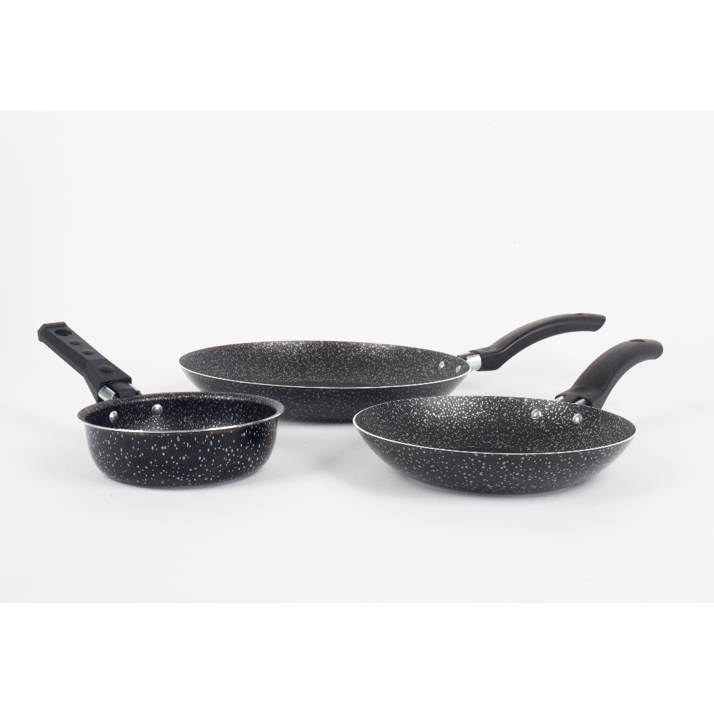 Conjunto de Frigideiras Black 3 Peças Alumínio Nacional! Neste conjunto você terá 3 produtos essenciais para qualquer cozinha: 1 Frigideira Ovo com 14 cm de diâmetro, 1 Frigideira Francesa com diâmetro 16 cm, 1 Frigideira Francesa com diâmetro 18 cm. Todas as peças são produzidas em Alumínio com revestimento Antiaderente Techflon em 5 camadas e possuem cabo antitérmico em baquelite para facilitar o manuseio. Dimensões aproximadas: Frigideira ovo Altura: 3,5cm Diâmetro: 14cm Comprimento:25cm Frigideira Francesa 16: Altura: 3,2 cm Diâmetro: 16 cm Comprimento: 29cm Capacidade: 0,52 Dimensões aproximadas: Frigideira Francesa 18cm: Altura:3,4 cm Diâmetro: 18 cm Comprimento:33,7cm Capacidade: 0,68