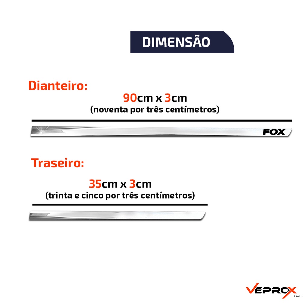 Friso Lateral Slim Volkswagen Fox 2003 2004 2005 2006 2007 2008 2009 2010 2011 2012 Kit Cromado Personalizado 2 Portas **(Nosso produto nao substitui a peca original e nem e no formato do mesmo, pois possui formato esportivo e deve ser aplicado sob a lataria do veiculo)** Conteudo da embalagem: - 02 Frisos dianteiros personalizados; - 02 Frisos traseiros. Dimensoes friso dianteiro: - Comprimento: 90 centimetros; - Altura: 03 centimetros. Dimensoes friso traseiro: - Comprimento: 35 centimetros; - Altura: 03 centimetros. Compativel com os modelos: - Fox 2003; - Fox 2004; - Fox 2005; - Fox 2006; - Fox 2007; - Fox 2008; - Fox 2009; - Fox 2010; - Fox 2011; - Fox 2012. Caracteristicas: - Produto novo de excelente qualidade; - Cromo de otima qualidade; - Marca Shekparts; - Parte central. Especificacao tecnica: - Encaixe perfeito; - Acabamento impecavel; - Nao e necessario furacao; - Fabricado em ABS de alta resistencia; - Acabamento cromado de alta qualidade; - Fixacao com fita dupla face (acompanha o produto); - Melhora a estetica e protege a lateral do veiculo. Dica: De um novo visual para seu veiculo, os frisos cromados Shekparts sao um diferencial e de facil instalacao. Importante: - Garantia de 90 dias; - Imagens meramente ilustrativas; - Valor anunciado referente ao Kit; - Para melhor fixacao do produto, aplique sobre a superficie limpa e seca, nao a molhando por 24 horas. Codigo de referencia: 17.179