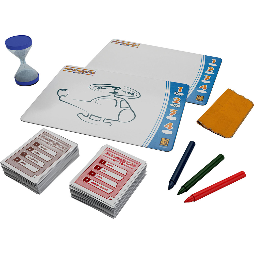 O clássico jogo de desenho e adivinhação agora em uma versão exclusiva para a criançada! Cada jogador será o desenhista e, na sua vez, tentará passar à sua equipe uma palavra ou expressão. É proibido falar, escrever letras e números e fazer gestos ou mímicas. Os únicos instrumentos que você terá à disposição são um lápis e um papel, para desenhar, esboçar e rabiscar o que quiser. Os colegas de equipe têm o tempo da ampulheta para adivinhar. E você não precisa ser desenhista, o que vale é a sua criatividade! O jogo foi desenvolvido especialmente para a idade de 5 a 10 anos, para estimular a criatividade na associação de desenhos e palavras. Quem tem de 5 a 7 anos, joga com o baralho azul, que possui palavras mais simples. Já quem tem de 8 a 10 anos, joga com o baralho vermelho, um pouco mais difícil e adequado à idade. São 480 palavras para desenhar. Cada carta tem quatro palavras.Na sequência, uma vai ficando mais difícil que a outra. A equipe só pode passar para a segunda palavra se acertar o desenho da primeira, e assim por diante. É preciso correr, porque o tempo é curto! Ganha a equipe que “matar” primeiro as quatro palavras desenhadas. Para isso, o que conta é muita criatividade e imaginação! Características: Gênero: Unissex. Referência: 01710. Idade recomendada: A partir de 05 anos. Conteúdo e Dimensões: Conteúdo: 01 Baralho com 60 cartas azuis; 01 Baralho com 60 cartas vermelhas; 02 Quadros plastificados para desenhar; 03 Gizes de cera; 01 Ampulheta; 01 Apagador; 01 Manual de instruções. Dimensões da Embalagem aprox.(AxLxP): 30 x 31 x 5,2cm. Informações Adicionais: Não recomendável para menores de 03 anos por conter partes pequenas que podem ser engolidas. Mais de 4 jogadores. Informações Técnicas: Marca: Grow Observação: Foto: Imagem Meramente Ilustrativa. Garantia (Fabricante): 3 MESES Garantia do vendedor: 7 dias