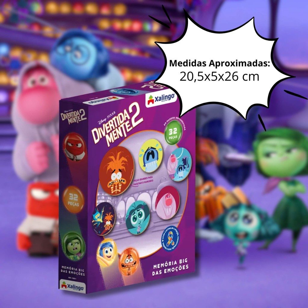 Explore o universo das emoções de forma lúdica com este incrível jogo de memória! Composto por 32 peças redondas de madeira reflorestada, cada uma medindo 8 cm de diâmetro, o jogo estimula o aprendizado emocional, a memória e a concentração das crianças. Ideal para momentos de diversão e desenvolvimento cognitivo em família ou na escola. - Dimensões Aproximadas (AxLxC): 20,5x5x26 cm - Idade Recomendada: +3 Anos - Número de Peças: 32 Peças Características: - Marca:XALINGO - Modelo:11254 *Imagens Meramente Ilustrativas* Conteúdo da Embalagem: - Jogo Memória das Emoções divertidamente 2 Big Xalingo - 32 Peças jogo da memoria - jogo xalingo - jogo memoria big - divertidamente - divertidamente 2