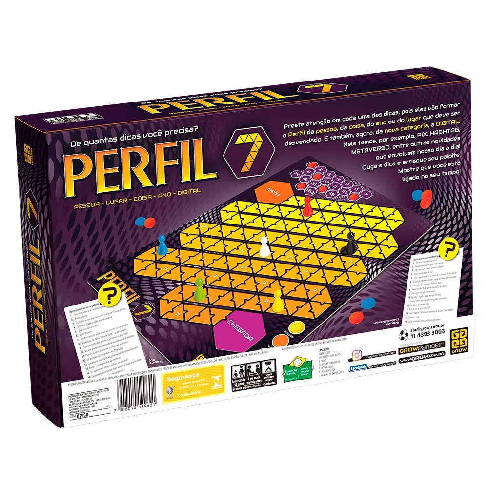 Jogo Perfil Um clássico atualizado para a sua diversão! Transforme seus dias em um desafio instigante com o jogo Perfil ! Preste atenção em cada uma das dicas, pois elas vão formar o Perfil da pessoa, da coisa, do ano ou do lugar que deve ser desvendado. Agora com uma nova categoria, A DIGITAL. Nela temos, por exemplo, PIX, HASHTAG, METAVERSO, entre outras novidades que envolvem nosso dia a dia! Tente descobrir qual é o perfil secreto que está sendo perguntado para você a cada rodada! Você tem o que é preciso para vencer? Como jogar Perfil ? O jogo de tabuleiro Perfil é ideal para 2 a 6 participantes a partir de 12 anos de idade. A cada rodada, uma carta com um perfil secreto é sorteada. Depois, os jogadores recebem dicas sobre o perfil secreto em questão durante a sua rodada. Quanto menos dicas você utilizar para acertar, mais pontos irá ganhar! De quantas dicas você precisa? São 350 cartas para você testar seus conhecimentos e sua capacidade de dedução! Todas as regras do jogo Perfil estão incluídas junto com o manual do jogo. Basta encontrar suas companhias, seguir as regras e partir para a diversão! Idade: A partir de 12 anos Participantes: 2 a 6 participantes Tempo estimado de jogo: Indeterminado Código do Produto: 02960 Especificações Técnicas Faixa Etária : A partir de 12 anos Componentes : 350 cartas, 1 tabuleiro, 6 peões, 20 fichas vermelhas, 1 ficha amarela, 5 fichas azuis e 1 manual de instruções Tamanho da Imagem : N/A Dimensões da embalagem : 23,0 x 35,5 x 6,5 cm Precisa de baterias ou Pilhas : N/A Participantes : 2 a 6 Garantia contra defeitos de fabricação (meses) : 3 Código de Barras : 7908010129601 Certificação Inmetro : CE-BRI/ICEPEX-N 01264-25 - NM300-2004 OCP 0046 Outras Informações : Não recomendável para menores de 3 anos, por conter partes pequenas.