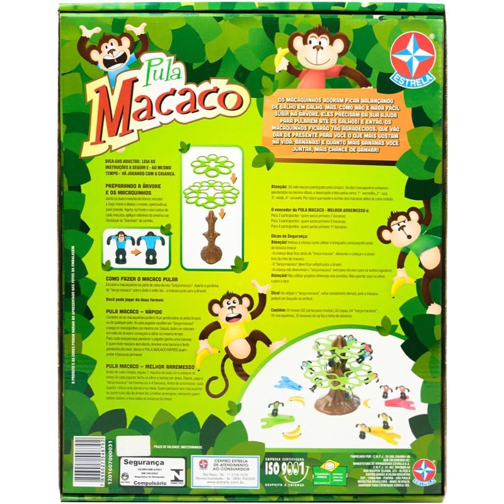 As cores podem variar entre as imagens mostradas acima e o produto. Imagens meramente ilustrativas. • Os macaquinhos adoram ficar balançando de galho em galho. Mas, como não é nada fácil subir na árvore, eles precisam da sua ajuda para pularem até os galhos! E então, os macaquinhos ficarão tão agradecidos, que vão dar de presente para você o que mais gostam na vida: Bananas! E quanto mais bananas você juntar, mais chance de ganhar! Este brinquedo é o presente ideal para meninos e meninas de todas as idades, especialmente recomendado para maiores de 04 anos de idade! • Conteúdo da embalagem: 01 Tronco, 02 Copas, 04 'Lanças-Macacos', 16 Macaquinhos, 16 Bananas de Cartão e 01 Folha de Adesivos Características do Produto • Dimensões aproximadas da embalagem: 29x07x35cm (AxLxC) • Composição do material: Plástico • Código do fabricante: 1201607000031 • Peso aproximado: 0.500 Idade recomendada: A partir de 04 anos Certificado pelos Órgãos Autorizados - OCP´S (Organismos de Certificação de Produtos)