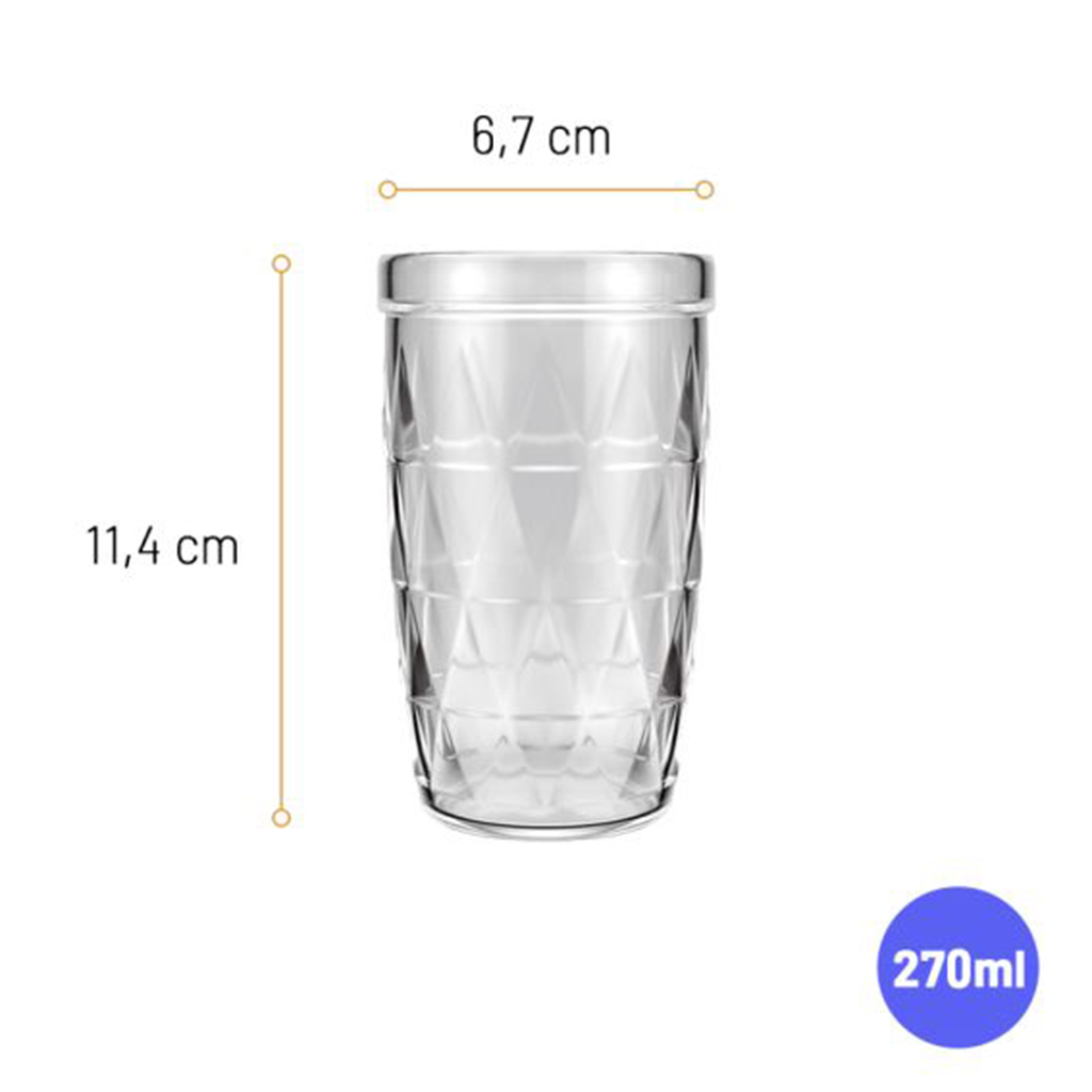 Jogo com 6 copos SM Zumba, com 270 ml, com design moderno e diferenciado. Esse lindo Conjunto de Copos no modelo Zumba contendo 6 peças, com capacidade de 270ml cada, da Nadir Figueiredo, seus convidados terão em mãos copos de vidro de alta qualidade e com design elegante. - Indicado para: Água, suco e refrigerante - Dimensões do Produto: Ø 6,7 x 11,4 cm - Peso: 0,16 kg Dica de uso e preservação: 1. Para limpeza, remova a sujeira com uma esponja macia, tire todo o resíduo de sabão e seque bem. 2. Não utilize abrasivos ou utensílios pontiagudos. 3. Submeter o vidro a mudanças bruscas de temperatura pode causar choque térmico e danificar seu produto. 4. Evite impactos.