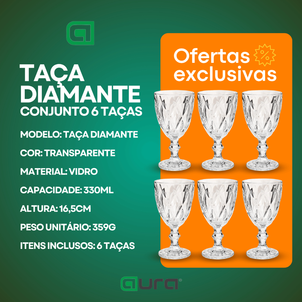 Conjunto com 6 Taças Diamante Transparente - 330ml Adicione um toque de sofisticação e elegância à sua mesa com o Conjunto de Taças Diamante . Perfeitas para servir água, vinho ou outras bebidas, essas taças são ideais para momentos especiais com familiares e amigos, proporcionando brindes mais graciosos e marcantes. Destaques do Produto: Design sofisticado: O modelo Diamante eleva a elegância de qualquer ocasião. Material Resistente: Produzido em vidro de alta qualidade, simples de limpar e com acabamento impecável. Capacidade Generosa: Cada taça comporta até 330ml, ideal para diversas bebidas. Informações Técnicas: Modelo: Taça Diamante Cor: Transparente Material: Vidro Capacidade: 330ml Altura: 16,5cm Peso Unitário: 359g Itens Inclusos: 6 Taças