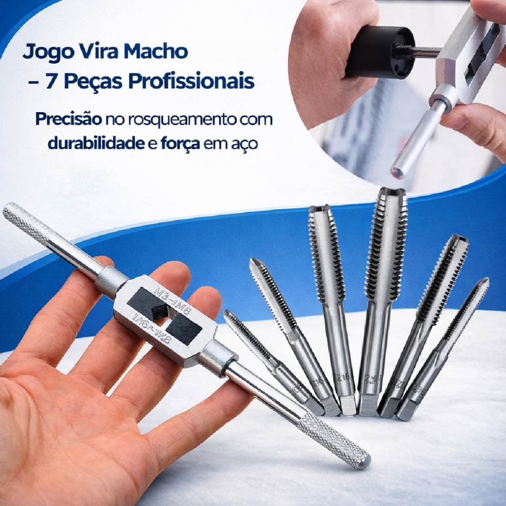 Jogo Kit Vira Macho M3 a M12 7 Peças Profissional Aço Titanium ⚙️ DESCRIÇÃO CURTA Rosqueamento preciso e resistente. Ferramenta profissional feita pra durar. ✅ DESTAQUES • Medidas M3 a M12 • Aço Titanium de alta durabilidade • Rosca limpa e precisa • Uso profissional e industrial • Ideal para aço, alumínio e metais • Alta resistência ao desgaste 📦 CONTEÚDO • 7 Vira Machos (M3 / M4 / M5 / M6 / M8 / M10 / M12) Ferramenta clássica de oficina. Rosqueou certo, resolveu. 🔩😏
