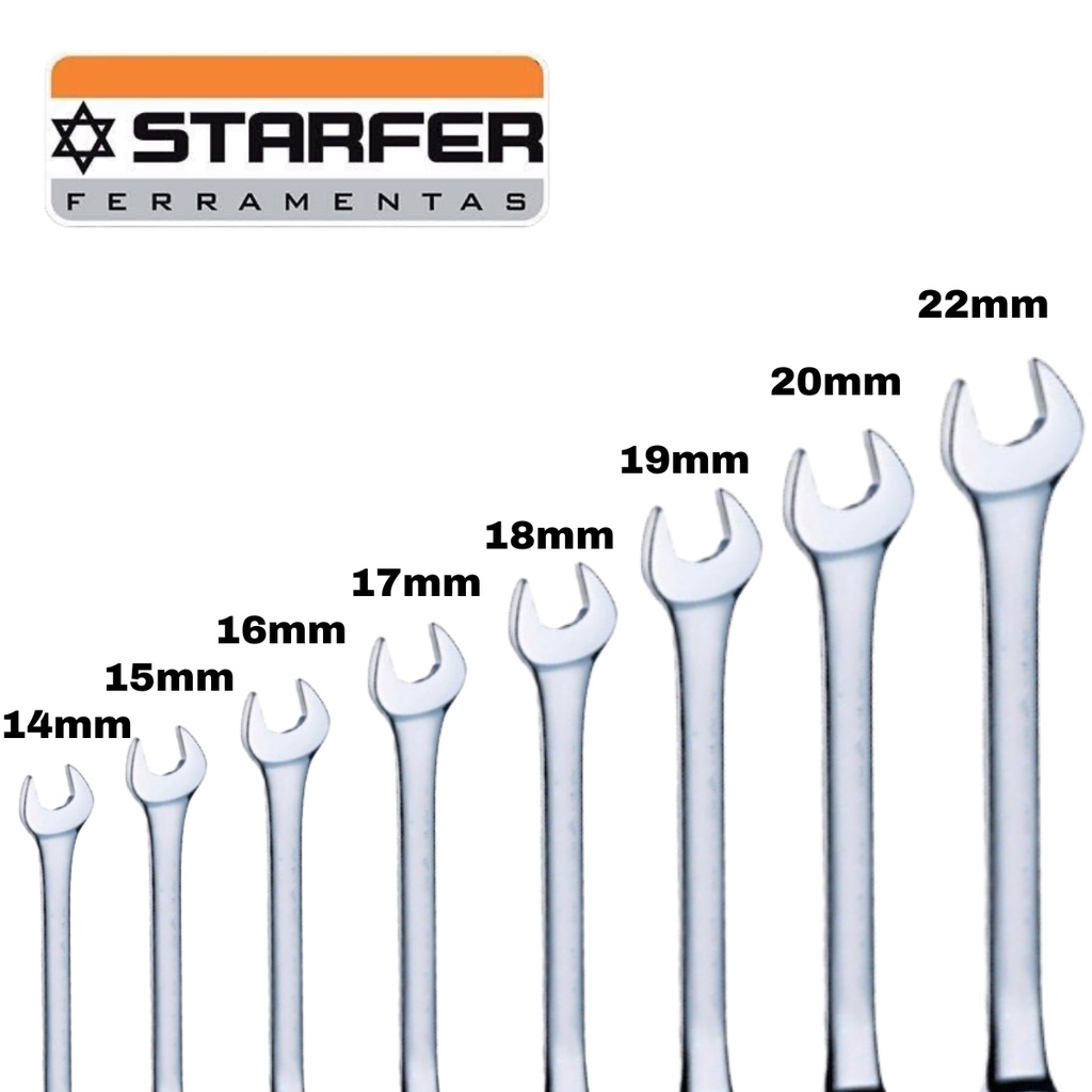 Jogo De Chave Fixa 6 Á 22 mm 8 Peças Starfer - Utilizada para aperto e desperto de porcas ou cabeça de parafusos - Possui bocas com medidas diferentes que proporciona maior combinação de parafusos - Produzido em Aço Carbono Cromado - Contem 8 peças sendo:6x7 8x9 10x11 12x13 14x15 16x17 18x19 20x22 Marca: STARFER
