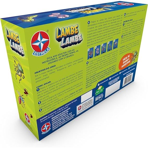 Jogo Lambe Lambe - EstrelaO Jogo Lambe Lambe da Estrela é a opção ideal para reunir a família e amigos em momentos de descontração e diversão. Um jogo de ação em que você ganha com muita agilidade. Enfileire as cartas com os insetos, e se posicione à frente delas. Embaralhe as cartas do monte, e revele a carta do topo e, com a língua de sogra, tente derrubar a carta correspondente antes de seu oponente. Seja o mais rápido a derrubar os insetos com a língua do sapo, acumule mais insetos e ganhe o jogo! Idade recomendada: A partir de 5 anos. Selo Inmetro: 012 346/2023. Diferenciais:Diversão em Família: Ideal para reunir pessoas de todas as idades para se divertirem juntas. Desenvolvimento: Estimula a criatividade, raciocínio e interação entre os participantes. Qualidade Estrela: Produto da Estrela, sinônimo de qualidade e confiança. Dicas de Uso:Reúna seus familiares e amigos, escolha um local confortável e prepare-se para momentos inesquecíveis de diversão. Siga as instruções do jogo e deixe-se envolver pelas atividades propostas, garantindo risos e boas lembranças para todos os participantes. Ficha Técnica:Nome do produto: Jogo Lambe Lambe; Marca: Estrela; Idade recomendada: A partir de 5 anos; Selo Inmetro: 012 346/2023; Inclui: 2 máscaras de sapo, 2 elásticos, 4 línguas de sogra de plástico, 10 cartas de jogo com abertura inferior, 10 cartas de monte e 1 saco zip
