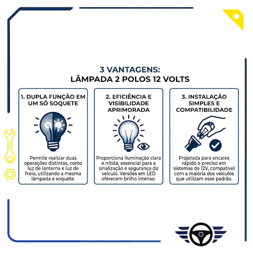 LÂMPADA 12V 2 POLOS VEICULAR Lâmpada automotiva 12V de 2 polos indicada para sistemas de seta conjugada e luz de freio. Desenvolvida para oferecer iluminação eficiente sinalização clara e segurança no trânsito. Indicada para função de freio e seta conjugada Iluminação clara para melhor visibilidade Compatível com sistemas elétricos 12V Uso comum em carros utilitários e veículos leves Características Técnicas Tensão 12V Sistema de 2 polos Aplicação veicular Função luz de freio e seta conjugada Encaixe padrão automotivo A lâmpada 12V 2 polos é essencial para manter o sistema de sinalização do veículo funcionando corretamente garantindo segurança e conformidade com as normas de trânsito. Produto de qualidade e preço justo!