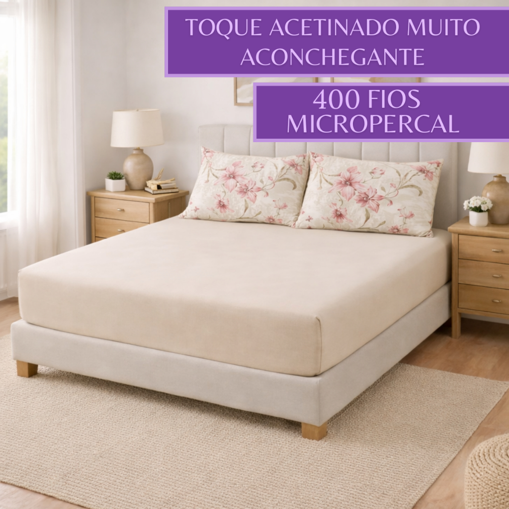 Jogo Lençol 400 Fios / Jogo Cama com Fronha Ziper/ Jogo Lençol 400 Fios / Lençol elástico / Lençol com fronha / Jogo Fronha com Ziper Parte Maior Transforme suas noites de sono com a suavidade e elegância do Jogo de Lençol 400 Fios. Desenvolvido para quem não abre mão de conforto e praticidade, este jogo de cama une a sofisticação do toque acetinado com a durabilidade que você precisa para o dia a dia. Fabricado em Micropercal 400 Fios, ele oferece uma experiência de sono extremamente aconchegante, com um tecido macio que acaricia a pele. Por que escolher este jogo de lençol? Acabamento Premium: A fronha possui fechamento com zíper escondido na parte maior, garantindo que o travesseiro não saia do lugar e mantendo o visual da cama sempre impecável. Fixação Perfeita: O lençol de baixo conta com elástico de 11mm em toda a volta (não apenas nos cantos). Isso garante que o lençol fique super esticado, firme na cama e não escape durante a noite, mesmo após várias lavagens. Alta Durabilidade e Tecnologia: Diga adeus aos lençóis que parecem velhos rapidamente. Este tecido não faz bolinhas, não desbota e repele poeira, mantendo a aparência de novo por muito mais tempo. Praticidade: Além de ser resistente, possui secagem rápida, ideal para a rotina moderna. Especificações Técnicas: Tamanho: Solteiro, Medidas do Lençol: 90cm (largura) x 1,90m (comprimento) x 30cm (altura) + 1 Fronha 50X70 Tamanho: Solteirão, Medidas do Lençol: 100cm (largura) x 2,00m (comprimento) x 30cm (altura) + 1 Fronha Fronha 50X70 Tamanho: Viúva, Medidas do Lençol: 128cm (largura) x 1,90m (comprimento) x 30cm (altura) + 2 Fronha Fronha 50X70 Tamanho: Casal, Medidas do Lençol: 140cm (largura) x 1,90m (comprimento) x 30cm (altura) + 2 Fronha Fronha 50X70 Tamanho: Queen, Medidas do Lençol: 160cm (largura) x 2,00m (comprimento) x 30cm (altura) + 2 Fronha Fronha 50X70 Tamanho: King, Medidas do Lençol: 195cm (largura) x 2,03m (comprimento) x 30cm (altura) + 2 Fronha Fronha 50X70 Tecido: Micropercal 100% Poliéster Contagem de Fios: 400 Fios Toque: Acetinado e Macio Principais Benefícios: # Toque acetinado muito aconchegante # Fronha com zíper prático # Elástico resistente em toda a volta do lençol # Não faz bolinhas (Anti-pilling) # Não desbota na lavagem # Secagem rápida e fácil de passar Garanta agora noites mais tranquilas e uma cama sempre linda com este Jogo de Lençol 400 Fios!
