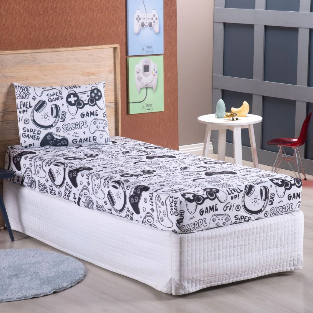Jogo Lençol Elastico Solteiro Roupa Cama Elasticada 2 Pçs Fronha Quarto Menino Video Game Branco