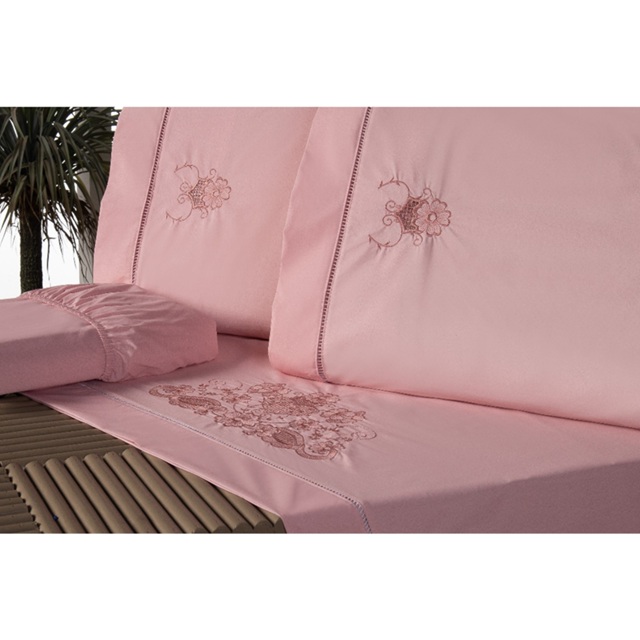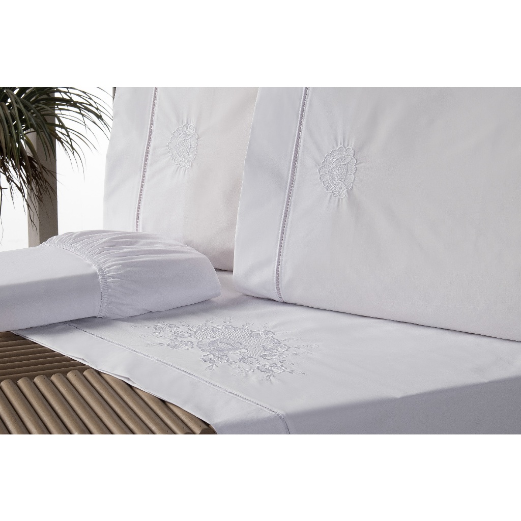 Jogo Lençol Queen Bordado Crivo 4 Peças 200 Fios 100% Algodão Percal