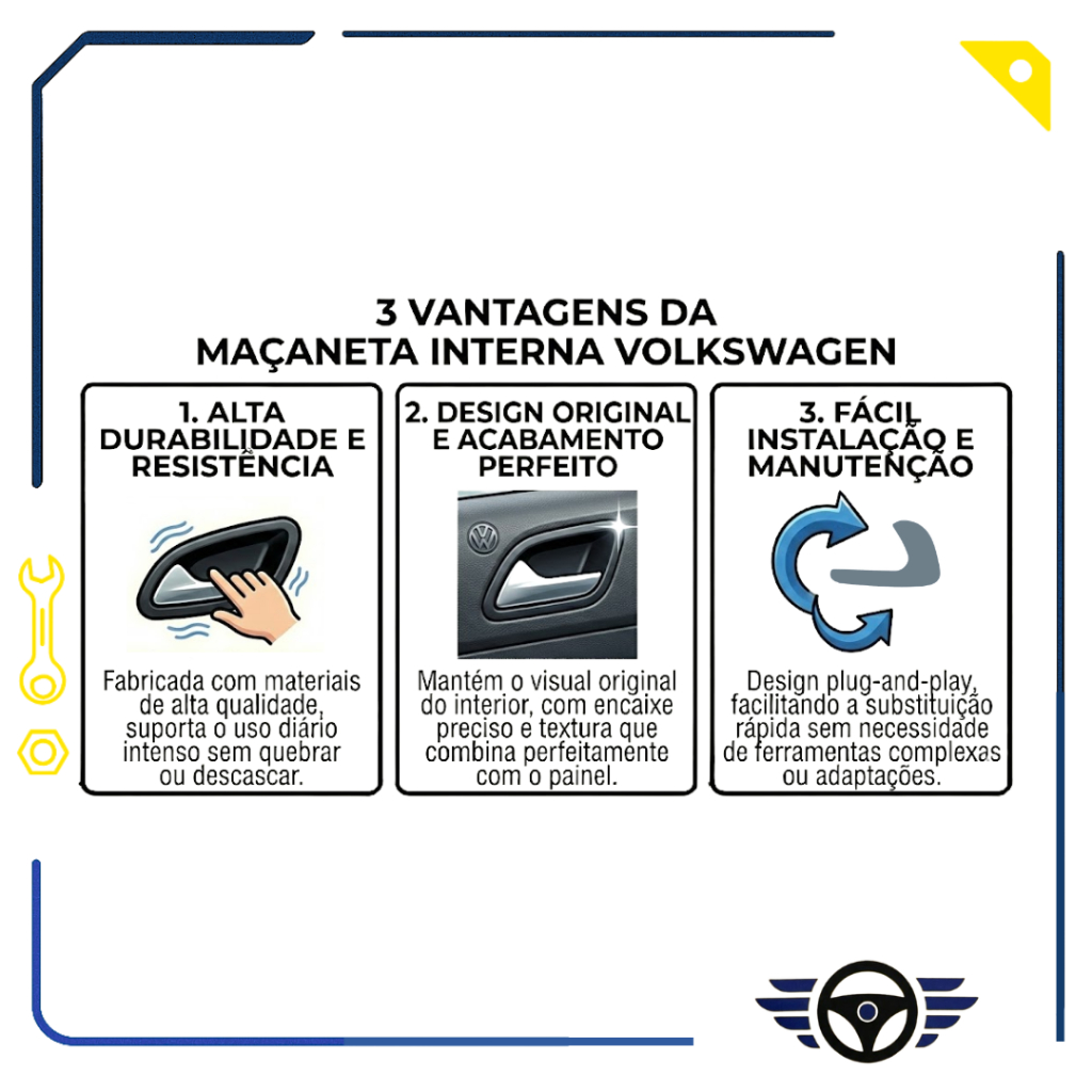 Maçaneta interna automotiva desenvolvida para reposição do sistema de abertura das portas do veículo Volkswagen Gol. Peça responsável pelo acionamento do mecanismo interno da porta garantindo funcionamento correto e seguro. Produto indicado para substituição de peças desgastadas ou danificadas restaurando a funcionalidade original do veículo. Indicado para abertura interna da porta Compatível com modelos Volkswagen Gol conforme aplicação Peça de reposição automotiva Instalação prática e encaixe adequado Restaura o funcionamento do sistema de abertura Características Técnicas Tipo maçaneta interna puxador gatilho Aplicação veicular Compatível com VW Gol Material resistente ao uso contínuo Encaixe padrão automotivo Uso para reposição A maçaneta interna VW Gol é um componente essencial para o correto funcionamento do sistema de abertura das portas garantindo segurança praticidade e conforto no uso diário do veículo. Produto de qualidade e preço justo!