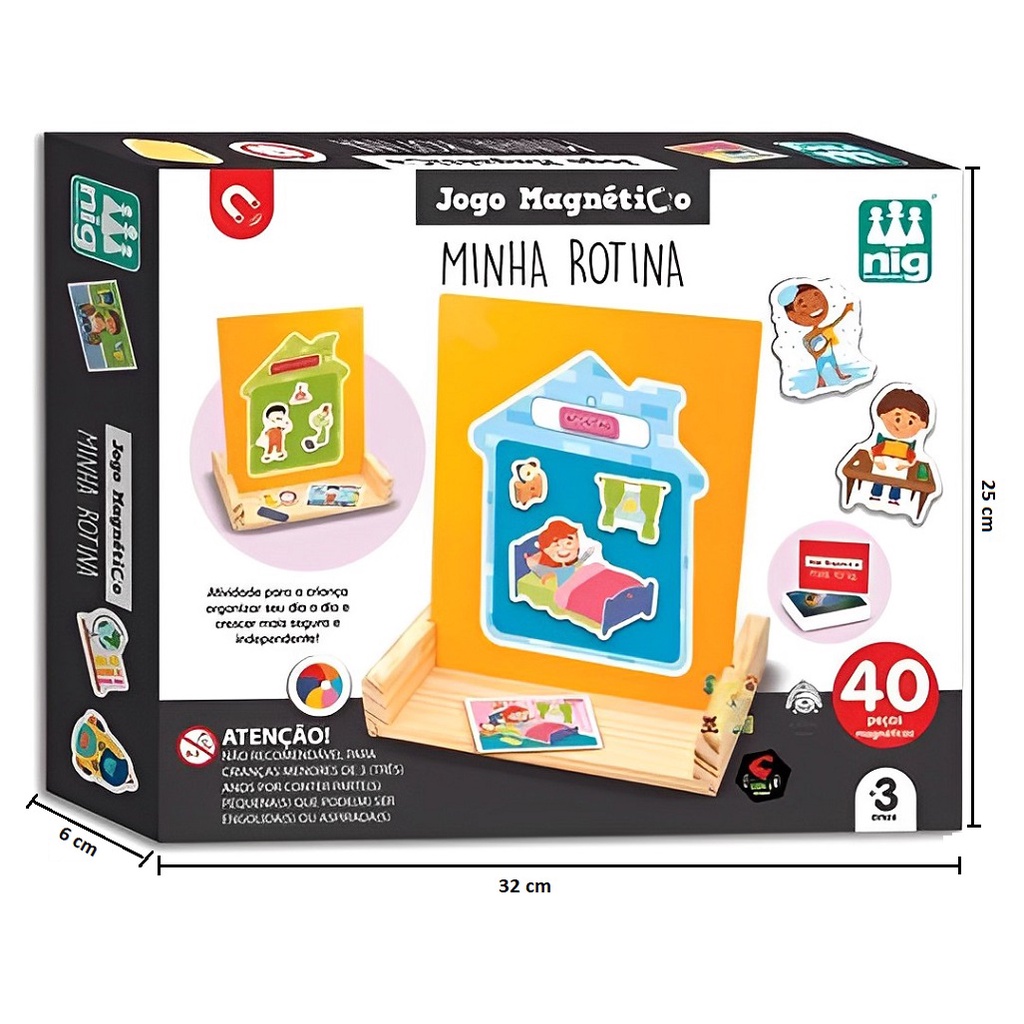 DESCRIÇÃO DO PRODUTO Minha Rotina: Criar uma rotina ajuda a criança e entender o que vem antes e depois em seu dia-a-dia, aumenta sua confiança e desenvolve a autonomia. Nesse jogo, ela vai montar no painel as cenas da rotina das cartinhas: acordar, escovar os dentes, tomar café. São 40 peças que podem ser usadas na frente e no verso do painel. CARACTERÍSTICAS TÉCNICAS Conteúdo da Embalagem: 01 Placa de Metal / 01 Base de Madeira / 40 Peças Magnéticas / 02 Adesivos / 10 Cartinhas de Atividades / 01 Regra. Dimensões Aproximadas da Embalagem: 25cm x 31cm x 06cm (Altura x Largura x Comprimento/Profundidade) Material/Composição: Metal e Madeira. Idade Mínima Recomendada: A partir de: 3 Anos Marca: NIG Brinquedos. Referência: 0466 Outras informações: As cores podem variar entre as imagens mostradas acima e o produto. Imagens meramente ilustrativas. Produto não recomendado para crianças menores de 3 anos, por conter partes pequenas que podem ser engolidas ou aspiradas. Aviso: As informações e imagens divulgadas são de total responsabilidade do fabricante/fornecedor. Produto lacrado e disponível a pronta entrega para todo Brasil! APROVADO PELO INMETRO