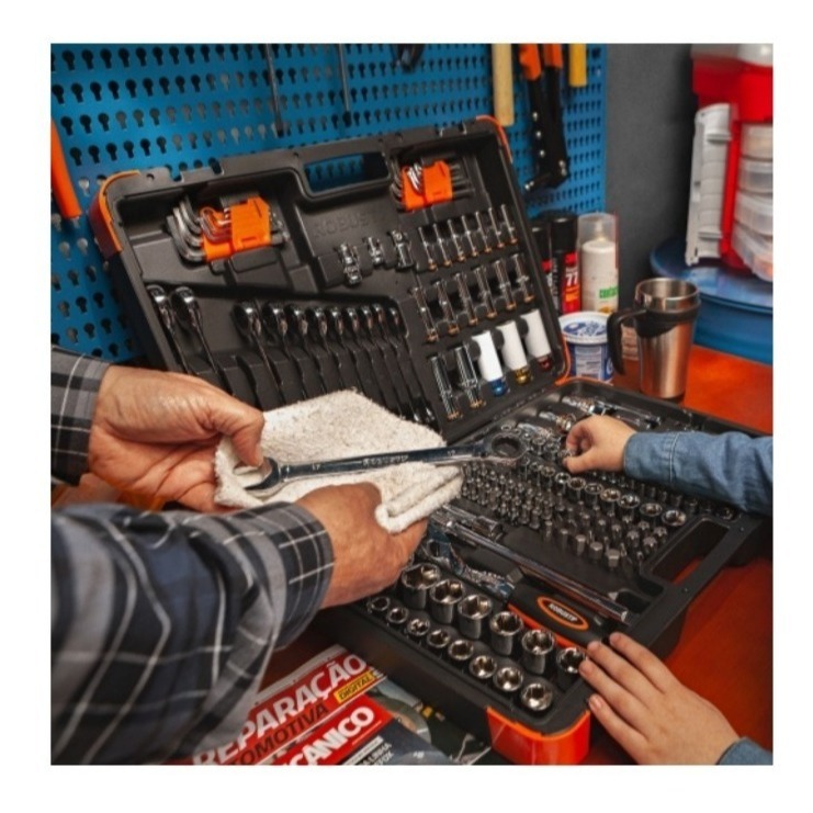 - ENVIO IMEDIATO - PRODUTO ORIGINAL - GARANTIA DE FÁBRICA - ENVIADO COM NOTA FISCAL JOGO OFICINA MASTER MALETA 178 PEÇAS GEDORE ROBUST 5000R CONTÉM 178 PEÇAS : SOQUETES E ACESSÉRIOS COM ENCAIXE DE 1/4" 13 Soquetes sextavados: 4, 4.5, 5, 5.5. 6, 7, 8, 9, 10, 11, 12, 13 e 14 mm 7 Soquetes sextavados longos: 4, 5, 6, 7, 8, 9 e 10 mm 5 Soquetes GTX (perfil hexalobular): E4, E5, E6, E7 e E8 4 Chaves soquete com ponta hexagonais: 3, 4, 5 e 6 mm 6 Chaves soquete com ponta fenda cruzada: PH0 (x2); PH1 (x2) e PH2 (x2) 4 Chaves soquete com ponta fenda simples nas medidas: 4, 5.5. 6.5 e 7 mm 8 Chaves soquete com ponta GTX (perfil hexalobular): T8, T9, T10, T15, T20, T25, T27 e T30 8 Chaves soquete com ponta GTX com guia (perfil hexalobular): T8, T9, T10, T15, T20, T25, T27 e T30 3 Chaves soquete multidentadas XZN: M8, M10 e M12 2 Extensões 50mm (2") e 100mm (4") 1 Catraca reversível 1 Junta Universal 1 Cabo T Cabo com encaixe SOQUETES E ACESSÓRIOS COM ENCAIXE DE 3/8" 10 Soquetes sextavados: 10, 11, 12, 13, 14, 15, 16, 17, 18 e 19 mm 6 Soquetes sextavados longos: 10, 11, 12, 13, 14 e 15 mm 1 Soquete para vela 18mm 6 Soquetes GTX (perfil hexalobular): E10, E11, E12, E14, E16 e E18 1 Extensão 125mm (5") 1 Catraca reversível Corpo para cabo T 1 Junta universal 1 Adaptador para bits 3/8" x 5/16" SOQUETES E ACESSÓRIOS COM ENCAIXE DE 1/2" 17 Soquetes sextavados: 10, 11, 12, 13, 14, 15, 16, 17, 18, 19, 20, 21, 22, 24, 27, 30 e 32 mm 2 Soquetes sextavados longos: 16 e 18 mm 3 Soquetes sextavados de impacto (para liga leve): 17, 19 e 21 mm 2 Soquetes para vela: 16 e 21 mm 2 Soquetes GTX (perfil hexalobular): E20 e E24 2 Extensões 125mm (5") e 250mm (10") 1 Catraca reversível Corpo para cabo T Junta Universal Adaptador para bits 1/2" x 5/16" BITS COM ENCAIXE DE 5/16" 5 Bits hexagonais: 7, 8, 10, 12, e 14 mm 4 Bits fenda cruzada: PH3 (x2) e PH4 (x2) 3 Bits fenda simples: 8, 10 e 12 mm 6 Bits GTX (perfil hexalobular): T40, T45, T50, T55, T60 e T70 6 Bits GTX com guia (perfil hexalobular): T40, T45, T50, T55, T60 e T70 CHAVES 9 Chaves L hexagonais abauladas: 1.5, 2, 2.5, 3, 4, 5, 6, 8 e 10 mm 9 Chaves L GTX (perfil hexalobular): T10, T15, T20, T25, T27, T30, T40, T45 e T50 12 Chaves combinadas com catraca: 8, 9, 10, 11, 12, 13, 14, 15, 16, 17, 18 e 19 mm