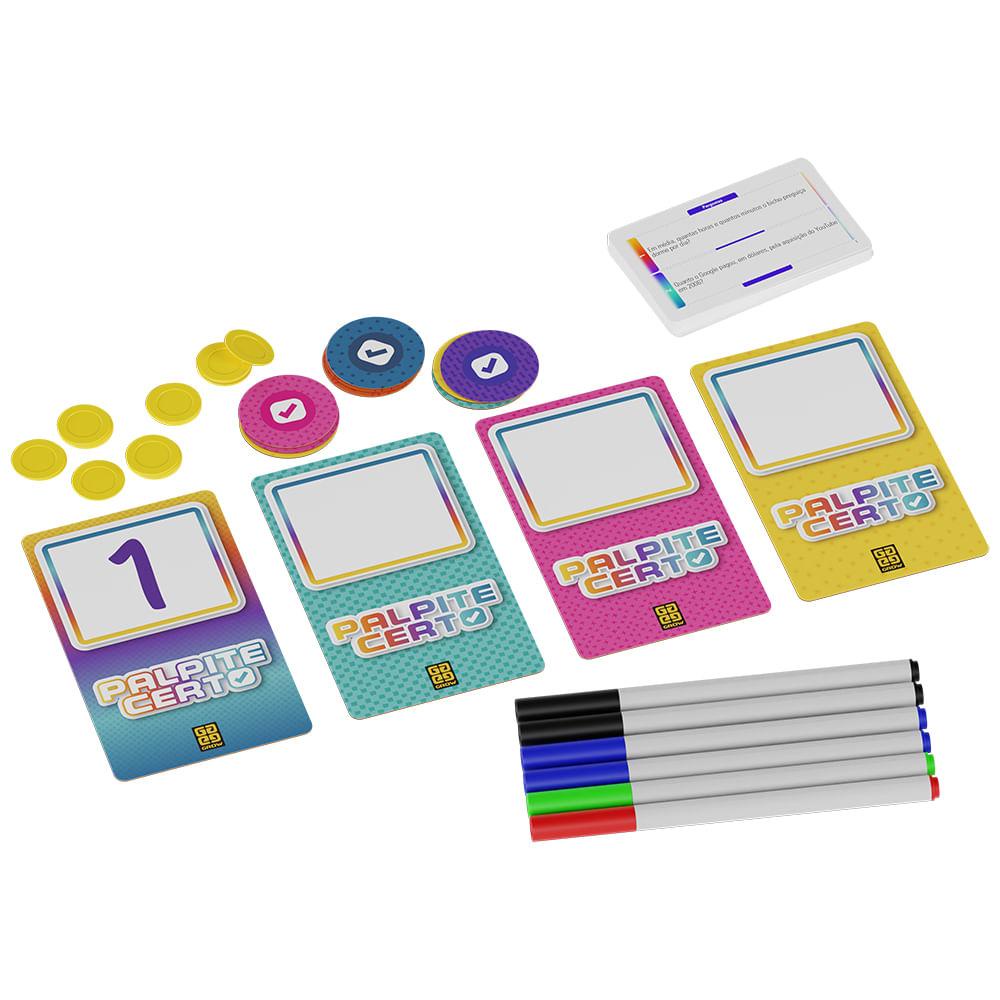 Palpite Certo é um jogo de perguntas e respostas diferente dos demais! Você não precisa saber as respostas exatas para vencer. O importante é apostar no palpite mais próximo! Todas as respostas serão NÚMEROS e QUANTIDADES! Caso ache que o palpite de outro jogador foi o melhor, você pode apostar nele também! É bem simples: alguém lê uma pergunta da carta e todos escrevem suas respostas em cartelas. Essas cartelas são apresentadas a todos os jogadores. Então é hora de apostar! Qual é o palpite mais certo? Sentindo-se confiante? Aposte em si mesmo. Acredita que o palpite de outro jogador é melhor? Aposte no dele. Não faz a menor ideia? Conte com sua sorte e aposte em qualquer palpite! Idade: A partir de 8 anos Participantes: De 3 a 6