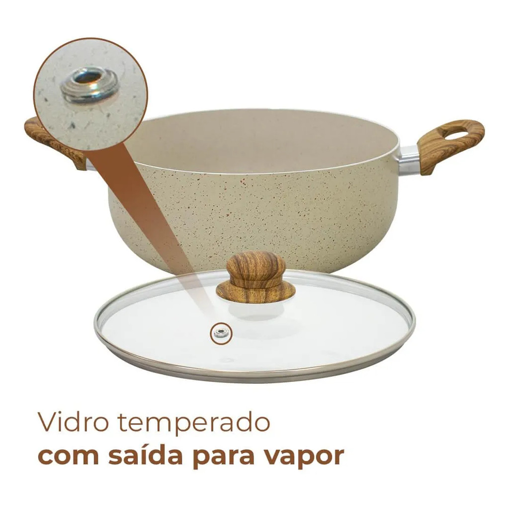 Jogo de Panelas Revestimento Cerâmico Antiaderente Casambiente 8 Peças O Conjunto de Panelas Sahara 8 peças possui revestimento antiaderente em cerâmica e 2,0mm espessura em sua estrutura, o que melhora o preparo de seus alimentos, pois a temperatura é dissipada de maneira uniforme e favorece o cozimento, evitando que sua comida queime facilmente. O Conjunto Casambiente 8 peças é indicado para fogões a gás, vitrocerâmico ou elétrico, é composto por três caçarolas, duas panelas com cabo, duas frigideiras e uma leiteira, todos em alumínio na cor vanilla com revestimento cerâmico marble. As panelas não grudam, são mais fáceis de limpar e mais saudáveis, pois necessitam de menos óleo para o cozimento e são livres de metais pesados. As peças do conjunto possuem cabos e alças com acabamento siliconado Soft-Touch amadeirado, que dão um toque macio e não esquentam, evitando acidentes. As tampas são de vidro temperado com saídas para vapor em inox e bordas em silicone, trazendo um design inovador, ideais para você que gosta de sofisticação e elegância em sua cozinha. Composição 8 peças: 1 Caçarola de 4,5L - Ø 24cm e 9,9cm de altura 1 Caçarola de 3,25L - Ø 22cm e 8,9cm de altura 1 Caçarola de 2,5L - Ø 20cm e 8,8cm de altura 1 Panela de 2,0L - Ø 18cm e 7,8cm de altura 1 Panela de 1,45L - Ø 16cm e 7,6cm de altura 1 Frigideira Ø 24cm e 4,7cm de altura 1 Frigideira Ø 20cm e 4,1cm de altura 1 Fervedor de 1,8L - Ø 14cm e 12cm de altura Recomendações: - Lavar antes do primeiro uso, untar com óleo e aquecer antes da primeira utilização. - Usar somente utensílios de madeira, silicone ou nylon. - Utilizar fogo médio ou baixo, pois as panelas distribuem uniformemente o calor. - Não esquentar o produto vazio. - Utilizar o lado macio da esponja e evitar uso de abrasivos. - Indicado para fogão a gás, elétrico. Características: Marca: Casambiente Modelo: Sahara Referência: AL177 Material da Panela: Alumínio Material do Cabo: Baquelite Siliconado (Soft-Touch) Material da Tampa: Vidro Temperado Revestimento Interno: Cerâmico Espessura: 2,0mm Cor: Vanilla Quantidade: 8 peças