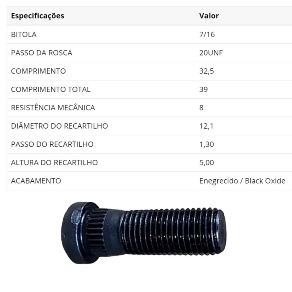 Jogo 6 Parafusos e Porcas de Roda ZM Chevrolet A10 C10 D10 – Padrão Original GM | Segurança e Fixação Reforçada Garanta fixação firme, segurança no rodar e compatibilidade total com seu Chevrolet clássico. O Jogo com 6 Parafusos e 6 Porcas de Roda ZM, desenvolvido no padrão original GM, é ideal para reposição ou manutenção preventiva dos modelos Chevrolet A10, C10 e D10. Fabricado com aço de alta resistência mecânica (classe 8) e acabamento zincado, este conjunto oferece durabilidade, encaixe perfeito e confiabilidade, mesmo em aplicações que exigem maior esforço, como veículos utilitários e de carga. Aplicação – Veículos Compatíveis CHEVROLET A10 C10 D10 Dica: Indicado para veículos que utilizam parafuso 7/16"-20UNF com porca cônica, conforme padrão original GM. Conteúdo do Jogo 06 Parafusos de Roda 06 Porcas de Roda Especificações Técnicas – Parafuso de Roda Diâmetro / Rosca: 7/16" Passo da rosca: 20 UNF Comprimento do corpo: 32,5 mm Comprimento total: 39 mm Diâmetro recartilhado: 12,1 mm Altura do recartilhado: 5 mm Passo do recartilhado: 1,30 mm Resistência mecânica: Classe 8 Especificações Técnicas – Porca de Roda Rosca: 7/16" Passo da rosca: 20 UNF Chave (CH/SW): 3/4" Altura da porca: 14,5 mm Modelo: Cônica Acabamento: Zincado Principais Benefícios do Jogo ZM Fixação segura e confiável – Parafusos e porcas com encaixe preciso, evitando folgas e vibrações. Padrão original GM – Medidas exatas, garantindo compatibilidade perfeita com cubos e rodas originais. Alta resistência mecânica – Classe 8, ideal para veículos utilitários e aplicações mais exigentes. Proteção contra corrosão – Acabamento zincado que aumenta a vida útil das peças. Manutenção segura – Ideal para reposição completa do conjunto de roda. Conteúdo da Embalagem 06 Parafusos de Roda 06 Porcas de Roda Marca: ZM Produto Original Alta Qualidade – Padrão Montadora GM Por que escolher o Jogo de Parafusos e Porcas ZM? Marca reconhecida no mercado automotivo Ideal para restauração e manutenção de veículos clássicos GM Encaixe perfeito sem adaptações Segurança e durabilidade comprovadas Não comprometa a segurança do seu veículo. Utilize peças corretas e de procedência confiável. Perguntas Frequentes (FAQ) 1. Este jogo serve em qualquer Chevrolet? Não. Indicado exclusivamente para os modelos Chevrolet A10, C10 e D10 que utilizam padrão 7/16"-20UNF. 2. Posso usar em rodas de liga leve? Sim, desde que a roda utilize porca cônica 7/16"-20UNF. Sempre confirme o tipo de assentamento da roda. 3. Os parafusos são de alta resistência? Sim. Os parafusos possuem resistência mecânica classe 8, adequados para veículos de carga e uso intenso. 4. Posso usar chave pneumática? Pode, porém recomenda-se finalizar o aperto com torquímetro, respeitando o torque especificado pelo fabricante do veículo. 5. O acabamento zincado evita ferrugem? Sim. O zincado oferece boa proteção contra corrosão, aumentando a durabilidade do conjunto. 6. Esse jogo é suficiente para quantas rodas? Este jogo atende uma roda completa (6 parafusos e 6 porcas). Verifique a quantidade necessária para o veículo completo antes da compra. 7. O produto é original? Sim. Produto original ZM, fabricado conforme padrão original GM, garantindo encaixe e segurança. Fixação correta é segurança no rodar. Garanta agora o Jogo de Parafusos e Porcas de Roda ZM para Chevrolet A10, C10 e D10 e mantenha seu clássico GM rodando com total confiança.
